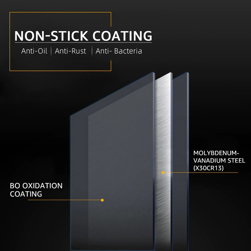 Rivestimento nero ----- Lama rivestita con vernice antiaderente può evitare che il cibo da attaccare per coltelli e prevenire efficacemente coltelli da la formazione di ruggine. Anche in grado di ridurre la resistenza di fette e li rendono comodo e facile da usare.