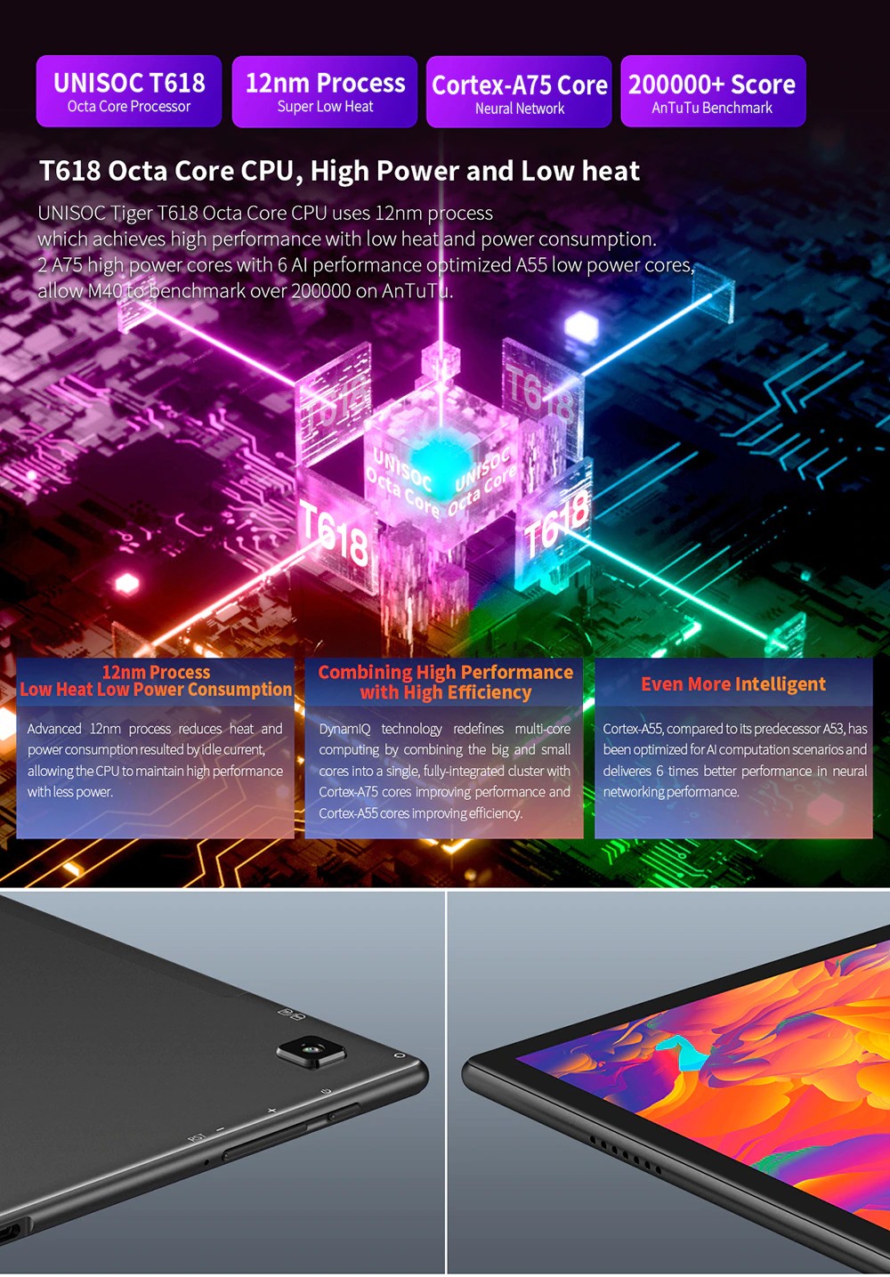 UNISOC Tigre T618 Octa Core CPU utilizza 12nm processwhich raggiunge ad alte prestazioni a bassa temperatura e potenza consumption.2 A75 di alta power core con 6 AI prestazioni ottimizzato A55 nuclei di bassa potenza, consentire M40 a punto di riferimento più di 210000 su AnTuTu.