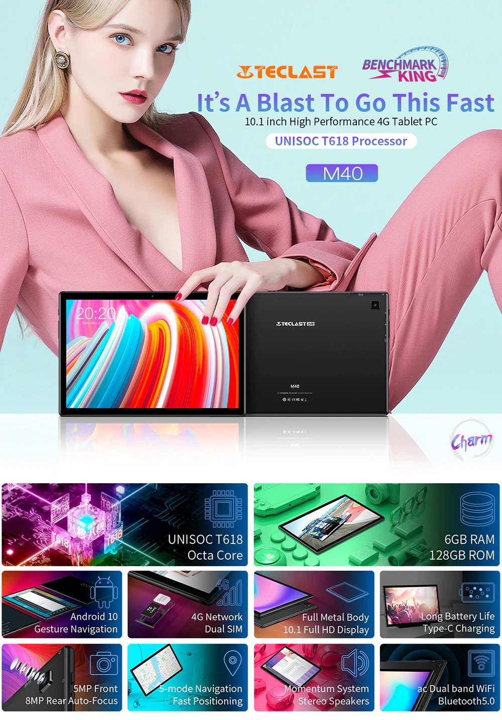 Tablet Teclast M40 10.1 ''1920X1200 Rete 4G Unisoc T618 Octa Core 6Gb Ram 128Gb Rom Tablet Pc Android 10 Dual Wifi Tipo-C
