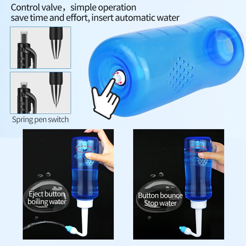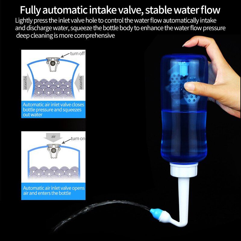 4. Postura corretta: Hanno la parte superiore del corpo proteso in avanti, guardando verso il basso, E con la testa leggermente appoggiato nessun lato, Tenere Premuto bottiglia a testa in giù, E inserire delicatamente la punta in una narice. Relax, bocca aperta leggermente e il respiro (attraverso la bocca). NON tenere il respiro. NON respiro attraverso il naso. Presse la valvola pulsante nella parte inferiore della bottiglia di acqua (Figura 1), E la soluzione scorrerà automaticamente. NON spremere la bottiglia di acqua. Soluzione di risciacquo entrerà la narice e fare il bagno il naso e dei seni e uscire dalla l'altra narice. Quando la finitura lavaggio una narice, rilasciare il pulsante per interrompere la soluzione. Ruotare per lavare sia le narici.
