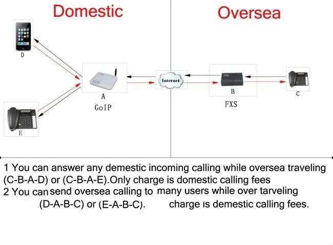 Telefono è un telefono comune. Softswitchis software installato in un computer. Esso si presenta come un server, Goip appare come cliente. Il regime ha bisogno di GoIP, telefono, softswitch, un altro telefono login softswitch attraverso comune dispositivo Gateway. Allora si può PSTN->VOIP e VOIP->PSTN