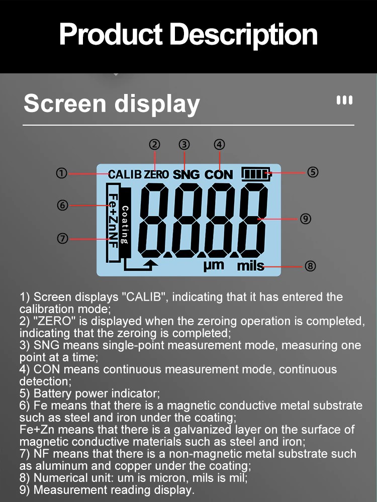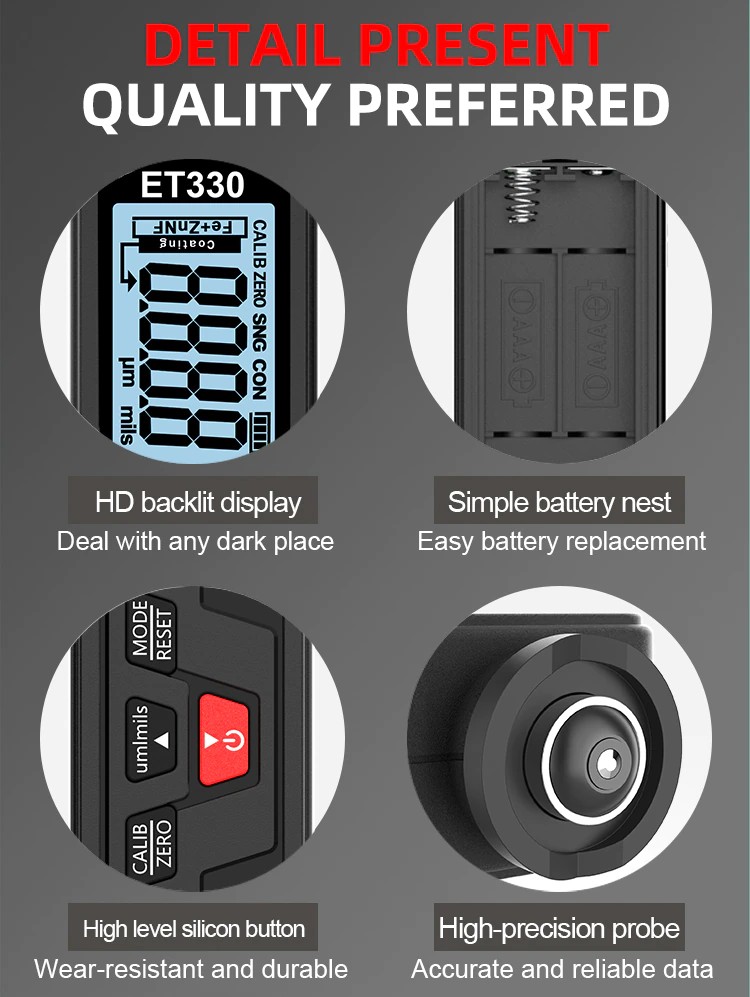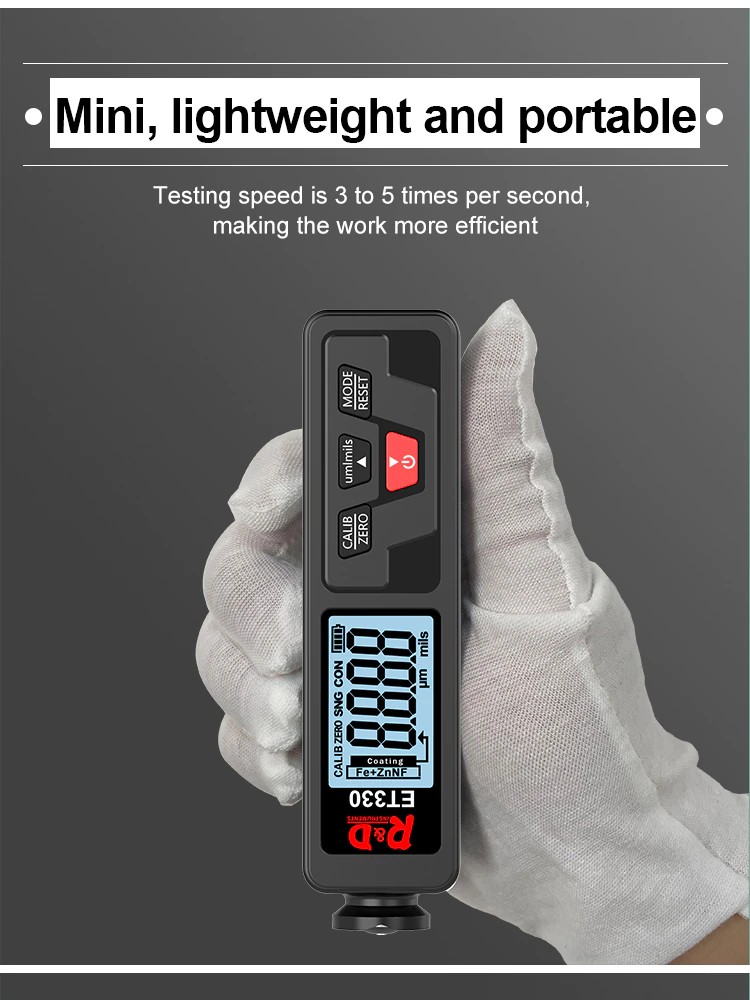 Il calibro è progettato per misurare in modo non distruttivo lo spessore del rivestimento e della pittura. È essenziale per il trattamento delle superfici dei materiali e ampiamente utilizzato nell'industria manifatturiera, nell'industria della lavorazione dei metalli, nell'industria chimica, nell'area di ispezione delle materie prime e anche in grado di lavorare costantemente in laboratorio, in officina e all'aperto.