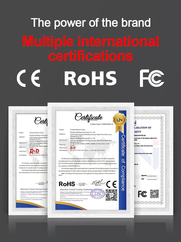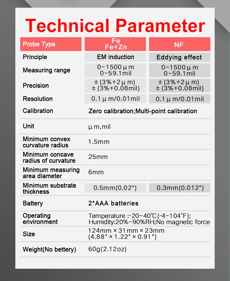 Il calibro prende la sonda integrata di precisione e utilizza i principi dell'induzione elettromagnetica e l'effetto a correnti parassite, che rileva automaticamente l'impezione dei substrati.