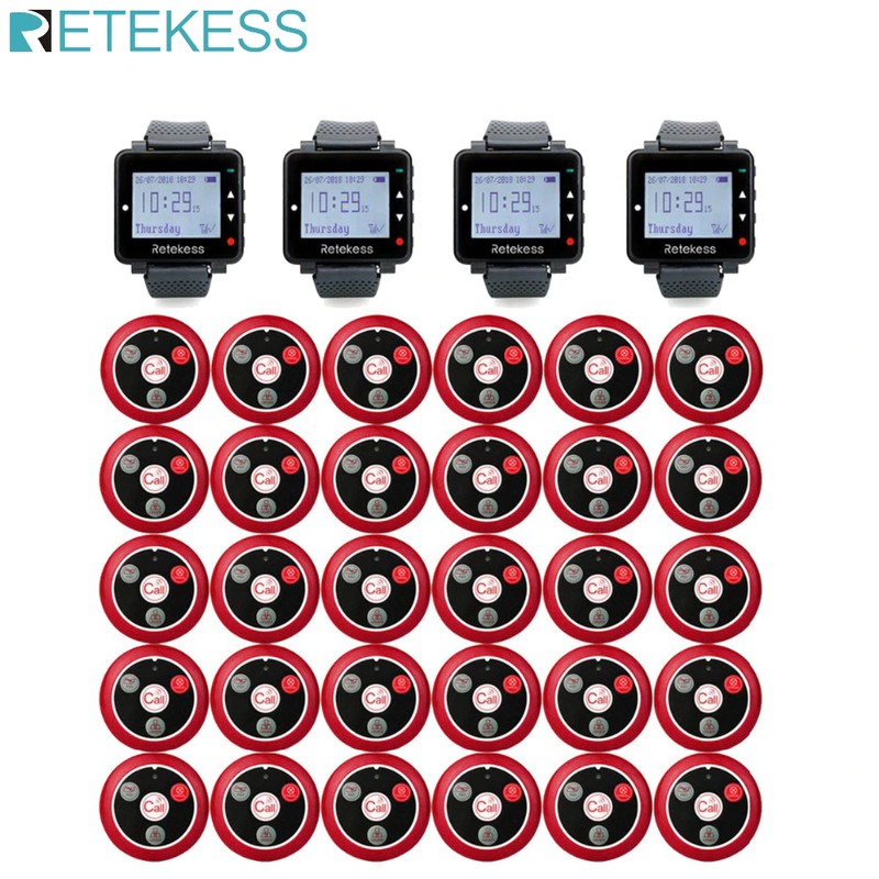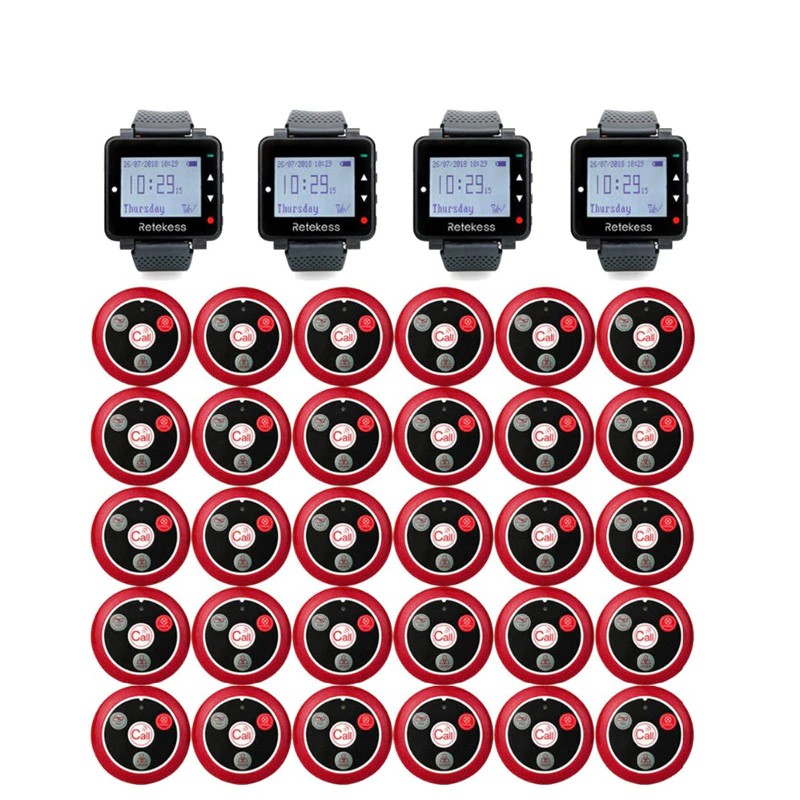 RETEKESS Ristorante Cameriere Sistema di Chiamata Senza Fili Tavolo Campana Cercapersone 4 Ricevitore Orologio + 30 Pulsante di Chiamata di Servizio Al Cliente Avvisatori Acustici