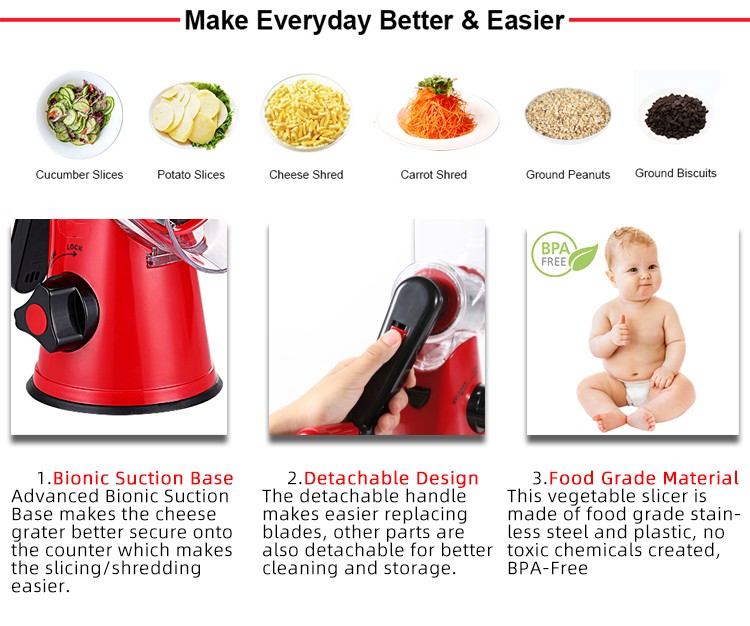Ragionevole tamburo-di tipo rotante di verdure trituratore ha potente di aspirazione piedi per la stabilità sulla vostra tavola. Questo lo rende efficiente e facile da usare!