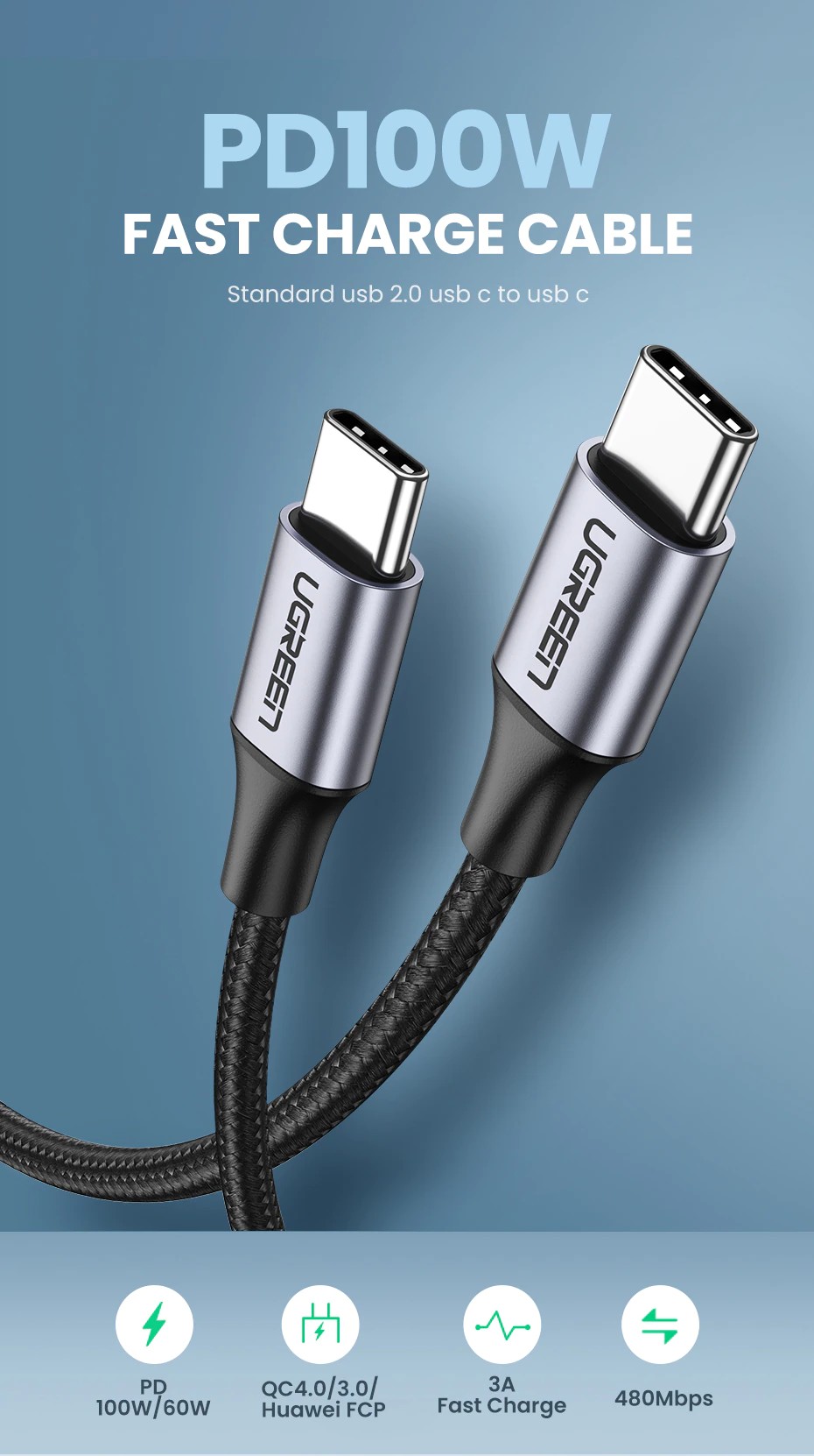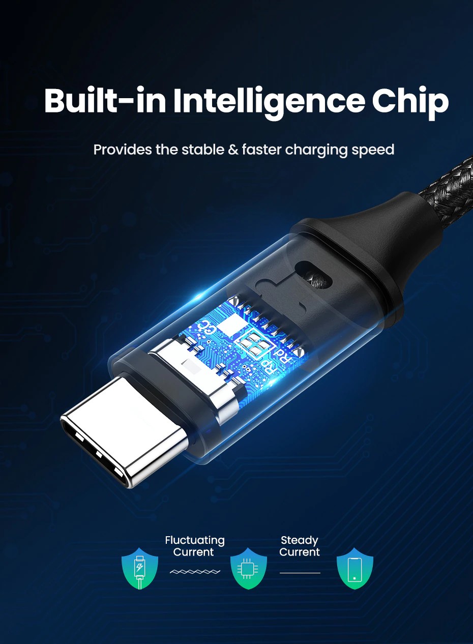 UGREEN USB C a USB C Cavo costruire in E-marker circuito integrato intelligente, che assicura sicuro di ricarica fino a 100W (20V 5A) potenza di uscita per il vostro laptop/mobile telefoni/compresse a piena velocità.