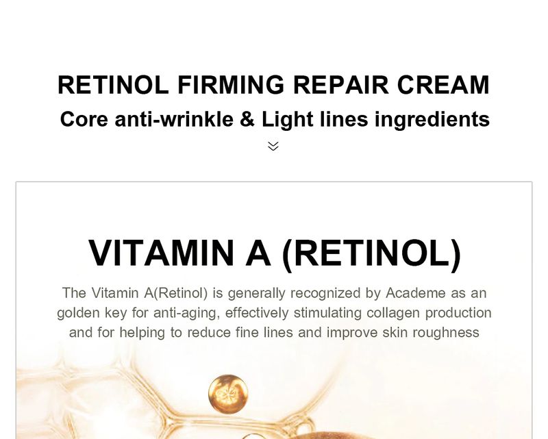 La Vitamina A (Retinolo) è generalmente riconosciuto da Academe come una chiave d'oro per anti-invecchiamento, efficacemente stimolare la produzione di collagene e per aiutare a ridurre le linee sottili e migliorare la rugosità della pelle