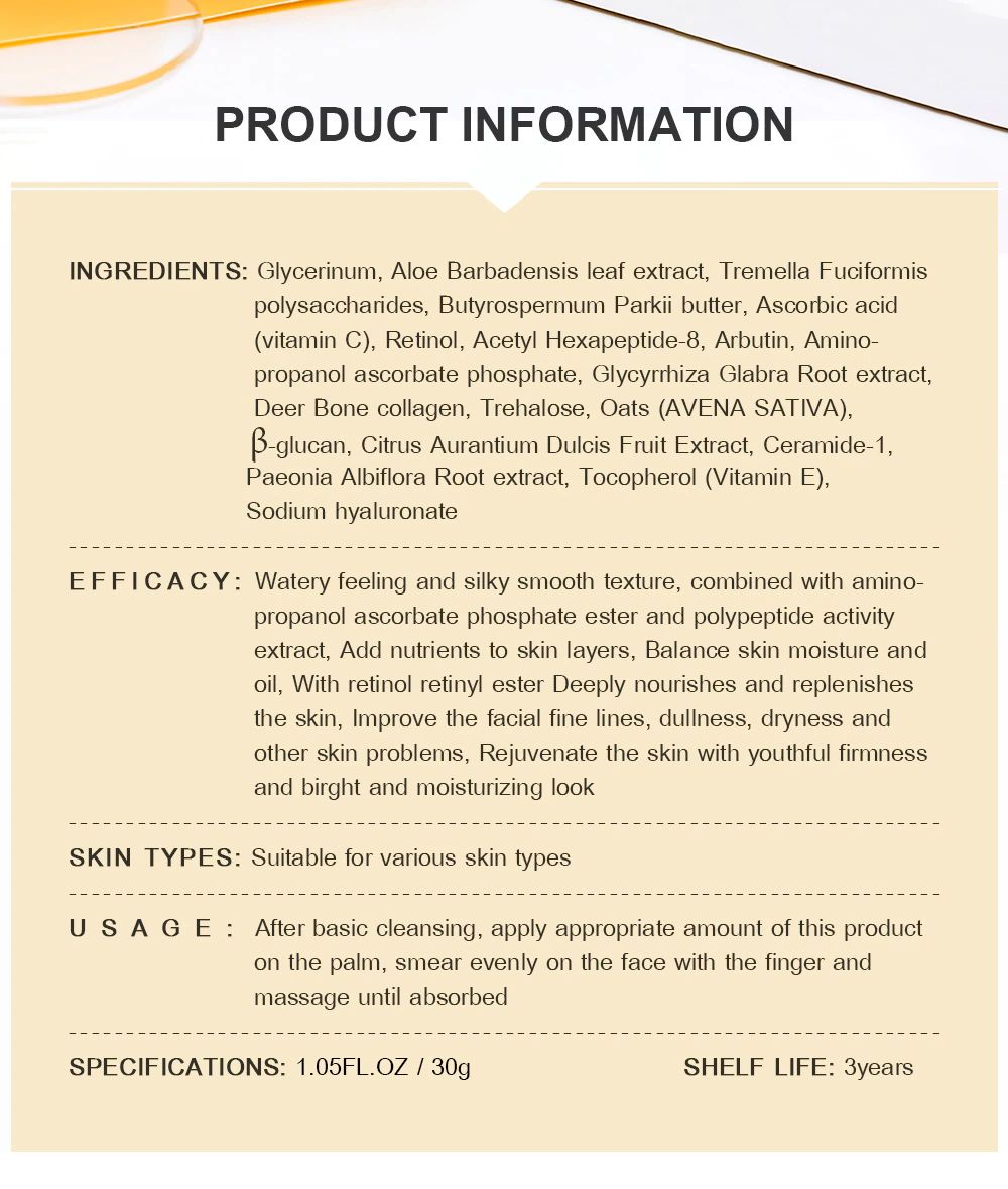 INGREDIENTI: Glycerinum, estratto di foglie di Aloe Barbadensis, Tremella Fuciformis polisaccaridi, Butyrospermum Parkii burro, acido ascorbico (vitamina c), Retinolo, Acetil Esapeptide-8, Arbutina, amino-propanolo ascorbate fosfato, Glycyrrhiza Glabra estratto di Radice, di Ossa di Cervo collagene, Trealosio, AVENA (AVENA SATIVA),B-glucano, Citrus Aurantium Estratto di Frutto Dulcis, Ceramide-1, Paeonia estratto di Radice di Albiflora, Tocoferolo (Vitamina E), ialuronato di Sodio
