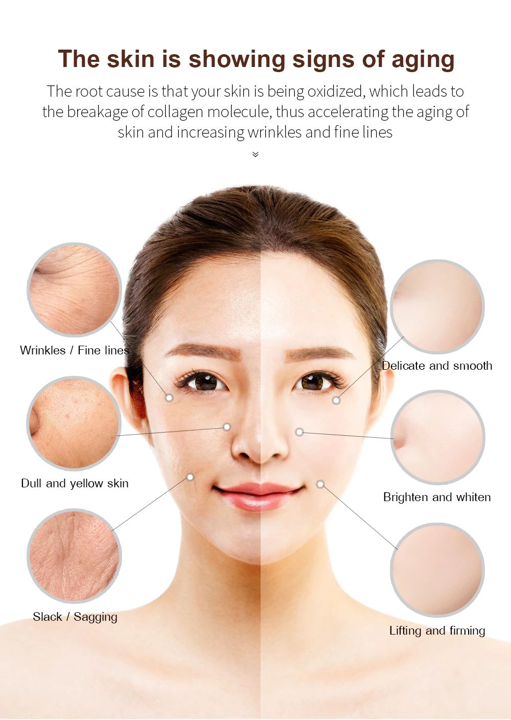 La causa principale è che la vostra pelle è di essere ossidato, che porta alla rottura di collagene molecola, accelerando così l'invecchiamento della pelle e aumentando le rughe e linee sottili