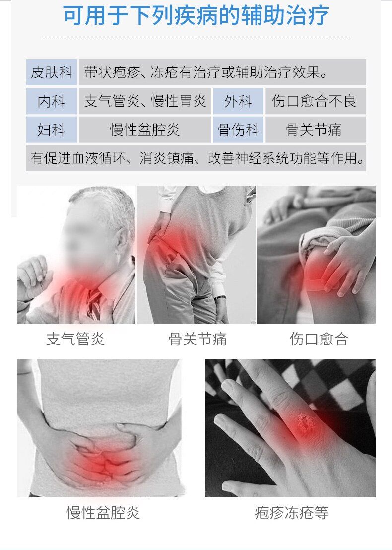 Il Zhoulin Spettro Apparecchi Terapeutici è un dispositivo di terapia che ha un ampio spettro di radiazione elettromagnetica di raggi infrarossi a base di energia e può essere estesa a millimetro onde (debole). Direttamente agisce sul corpo umano per produrre fisiologico benefico e le reazioni biochimiche, regolare il corpo di funzionale del sistema, e di ottenere effetti terapeutici. Adatto per la bronchite, ossa e dolori articolari, scarsa la guarigione delle ferite, malattia infiammatoria pelvica cronica, gastrite cronica, bandoid eruzione cutanea, il congelamento, lombare cervicale dolore della colonna vertebrale e di altre trattamento. Promuove la circolazione del sangue, riduce l'infiammazione e analgesia, e migliora la funzione del sistema nervoso.