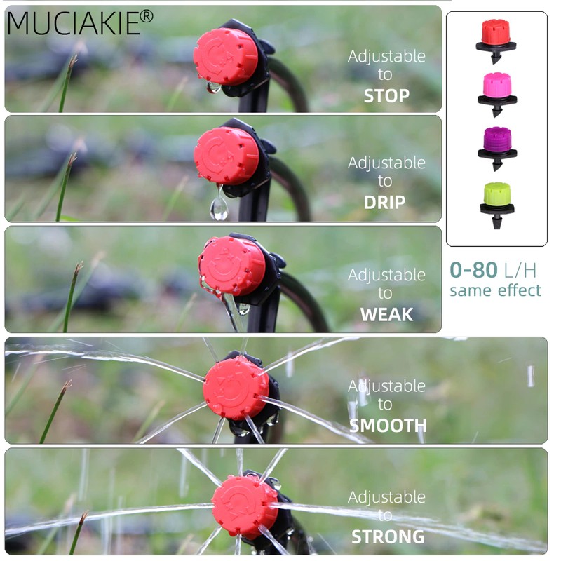 -調節可能なドリッパー: 8コンセント。 調整可能-その流量調整は、水やりを大きなドリップスプレーから穏やかな流れのパターンに変えるか、完全に遮断することを意味します。 フロー調整用のシンプルな指先キャップコントロール。