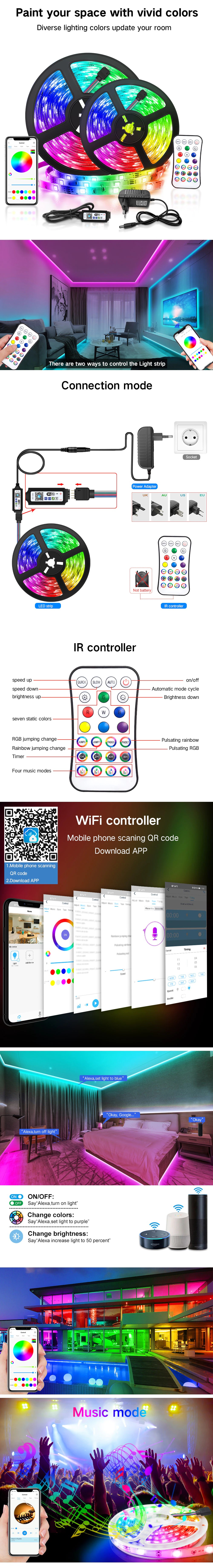 リモコンと電源を備えたLEDストリップライト,wifi,smd,2835/5050 rgb