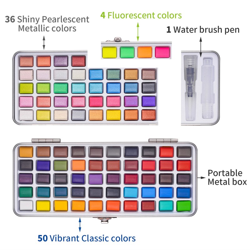 改良された製造プロセス、濃縮顔料、耐久性、それは初心者や一般的な水彩愛好家のニーズのほとんどを満たすことができます。 メタリック色。 マカロンカラー蛍光色。 従来の色。 この1セットだけで、ほとんどすべての水彩スタイルを手に入れることができます。 サイズの面では、私たちの水彩画は初心者が半年以上使用するのに十分です。私たちが使用した顔料は高濃度です。長時間使用できます。期待は、私たちはより色楽しむことができるよう。