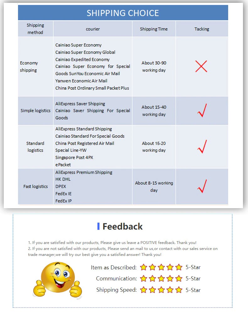 1。私たちはあなたに最も安い価格を提供しているので、パッケージが中国を離れた後に物流情報はありません。通常の状況でパッケージを受け取ることができます。時間の保証の下でパッケージを受け取っていない場合は、私たちに連絡してください、私たちはあなたのために交換または返金を処理します、ありがとう。