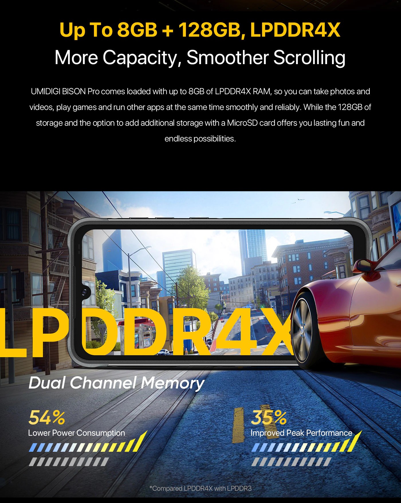 Umidigiバイソンのプロ8ギガバイトにアップロードしていLPDDR4X ram、写真とビデオ取ることができるので、ゲームをプレイと他のアプリ実行同時に円滑かつ確実。 128GBのストレージとmicrosdカードでストレージを追加するオプションは、あなたに永遠の楽しみと無限の可能性を提供します。