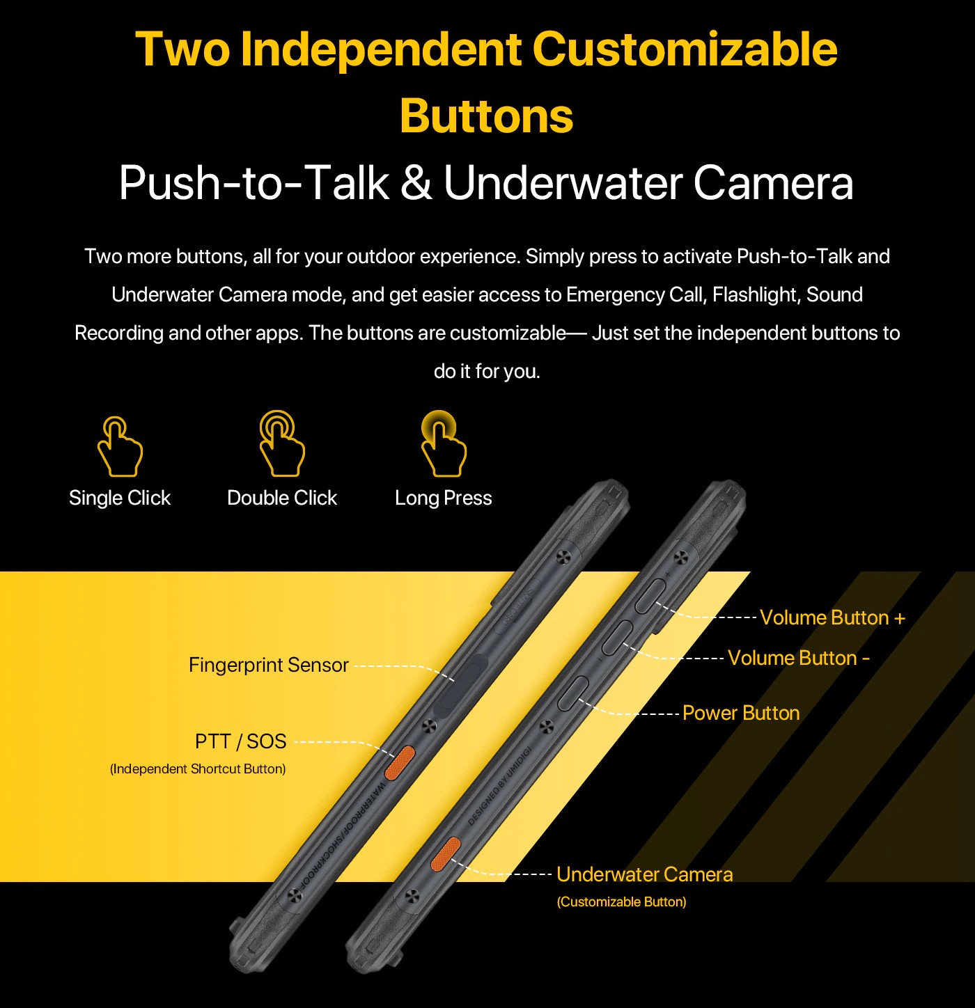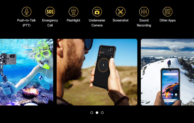 さらに2つのボタンがあり、すべて屋外での使用に適しています。 押してプッシュツートークや水中カメラモードを有効にするだけで、緊急通話、懐中電灯、録音、その他のアプリに簡単にアクセスできます。 ボタンはカスタマイズ可能です-独立したボタンを設定するだけです。
