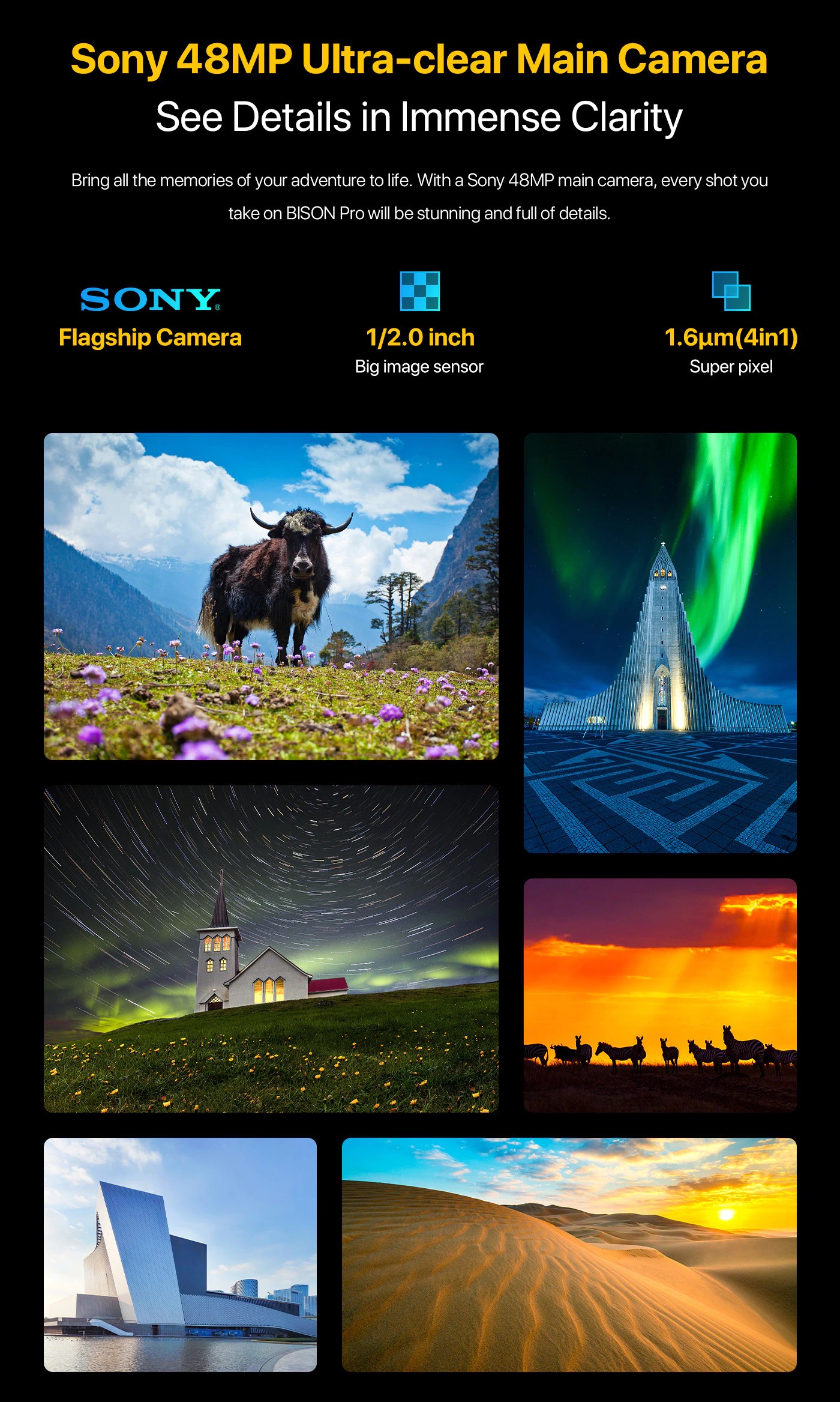 冒険のすべての思い出を実現します。 ソニーの48mpメインカメラで、バイソンプロで撮影するすべての写真は素晴らしいものになり、詳細でいっぱいになります。
