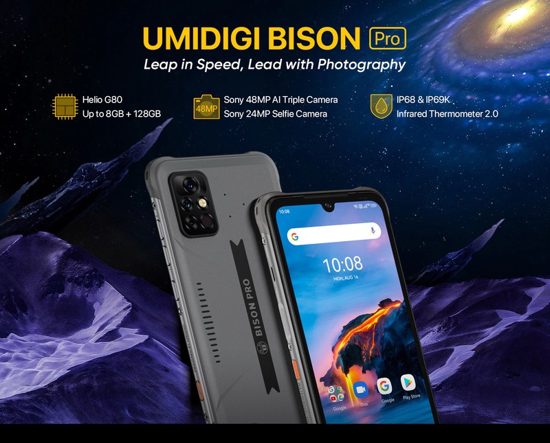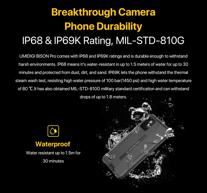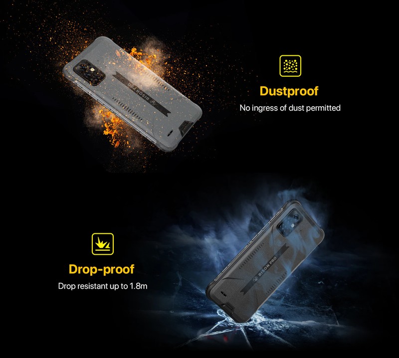 Umidigi bison proはIP68およびip69kの定格を備えており、厳しい環境に耐えるのに十分耐久性があります。 IP68は、最大1.5メートルの水に最大30分間防水性があり、ほこり、汚れ、砂から保護されていることを意味します。 Ip69kにより、電話は熱蒸気洗浄テストに耐え、100 bar(1450 psi) の高い水圧と80 ℃ の高い水温に耐えます。 また、MIL-STD-810G軍事基準認証を取得しており、最大1.8メートルの落下に耐えることができます。