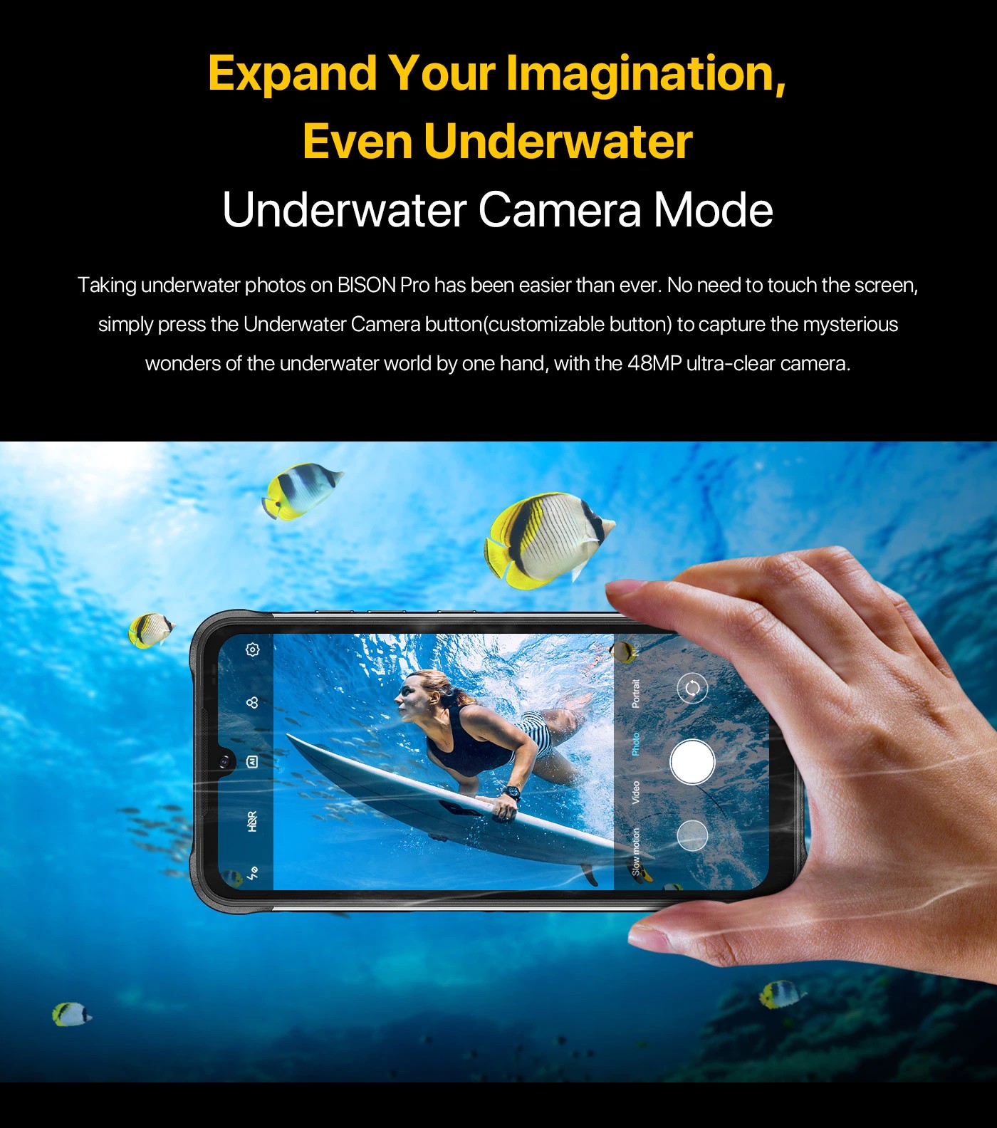 バイソンプロで水中写真を撮るのがこれまで以上に簡単になりました。 画面に触れる必要はありません。水中カメラボタン (カスタマイズ可能なボタン) を押すだけで、48mpの超鮮明なカメラで水中世界の不思議な驚異を片手でキャプチャできます。