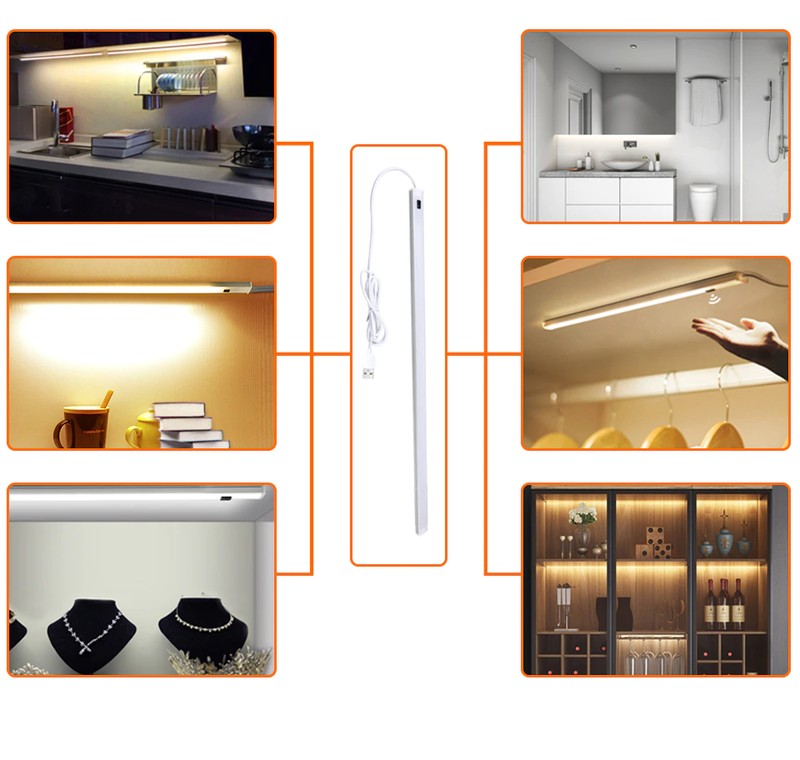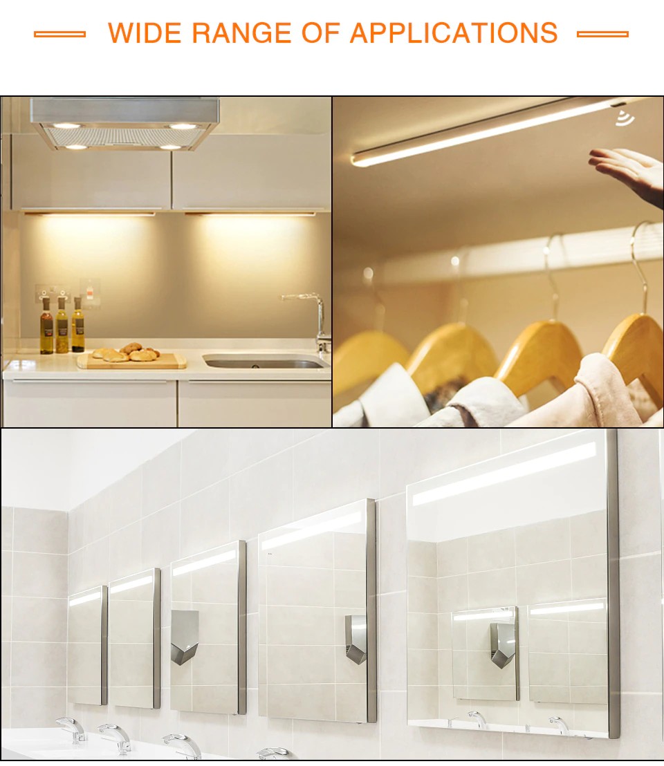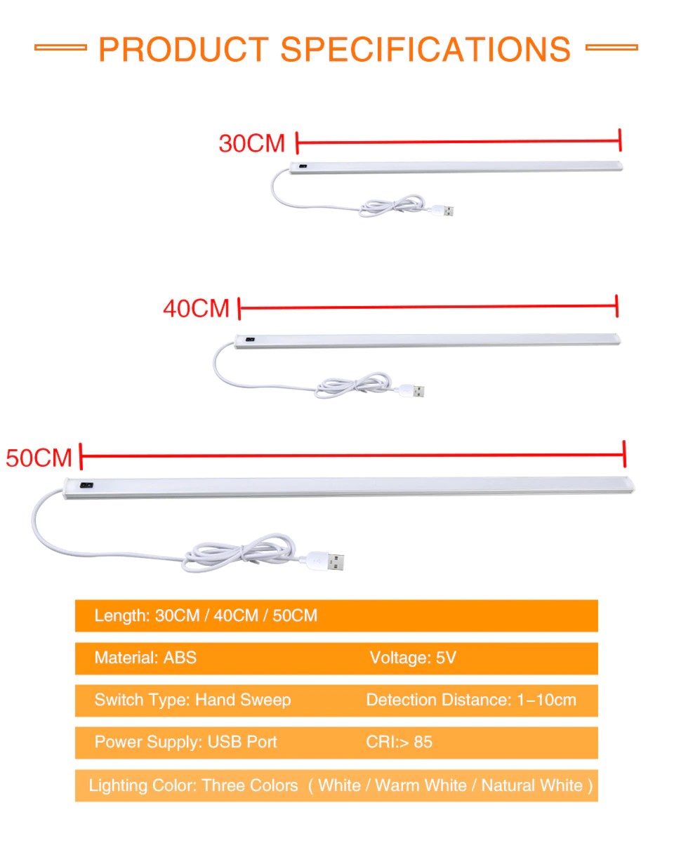 特徴: 1。ハンドスイープセンサースイッチ付きのこのライトは、手が濡れているときにスイッチに触れたくない場所、キッチン、トイレに最適なソリューションです。スイッチに手を振るだけで光を作動させ (作動距離は1〜10cm) 、もう一度手を振るとオフになります。 2.ベッドサイドキッチンとキャビネット、ワードローブ、クローゼット、階段、デスク、テーブルに最適です。 3.軽量で簡単な取り付け: 粘着ストリップやネジで好きな場所に貼り付けることができます。 仕様: スイッチタイプ: ハンドスイープセンサースイッチ 照明色: 白/暖かい白/自然白 色温度: ウォームホワイト (2800k-3200k)/ホワイト (6000k-6500k)/ナチュラルホワイト (4000-4500k) Ledタイプ: 2835SMD 長さ: 30 /40 /50センチメートル 電圧: DC 5v Powered by: USBケーブル USBケーブル長: 約1m 検出距離: 1-10 cm Cri: >85 材料: アルミニウム合金 + ABS