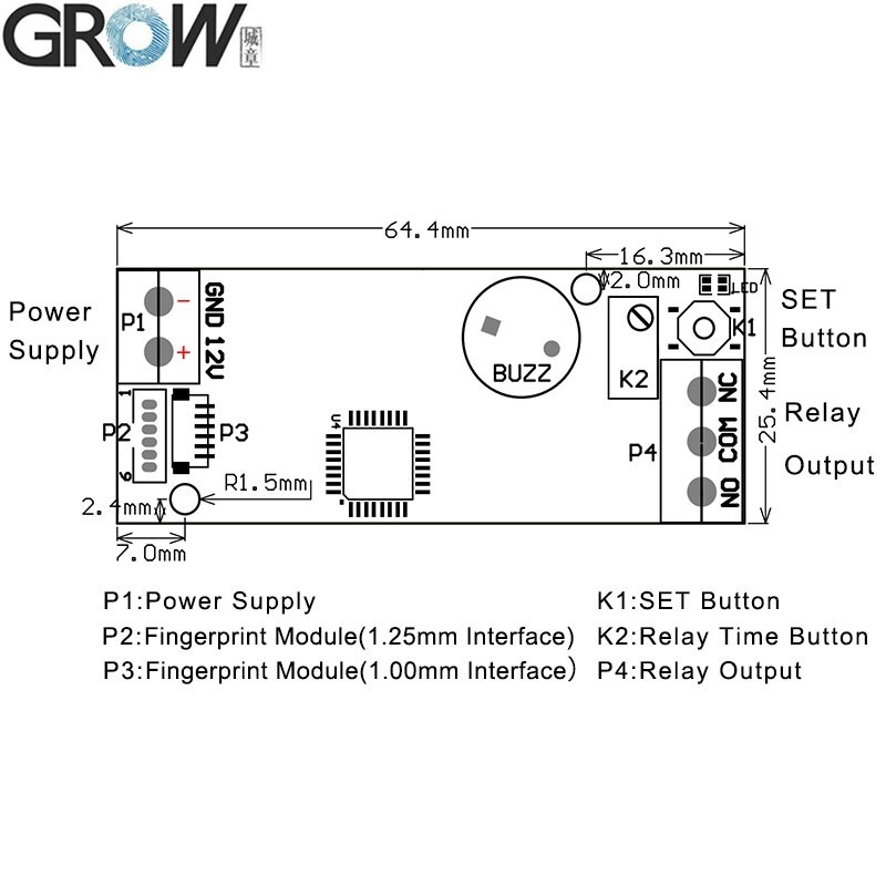 6.使用法:指を押すと、指紋が通過した後にリレーが閉じ、閉じる時間はk2によって決まります。