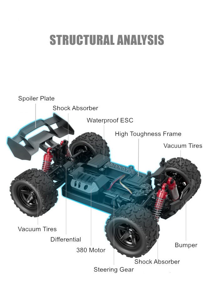 製品構成: 4wd \ 2.4 ghz \ 1.5gステアリングギア \ 防水一体型esc \ 充電保護 \ モーターアンチジャミング保護 \ 低電圧停電機能 \ フル車両ベアリング \ 独立したサスペンションシステム \ 独立したショックアブソーバー