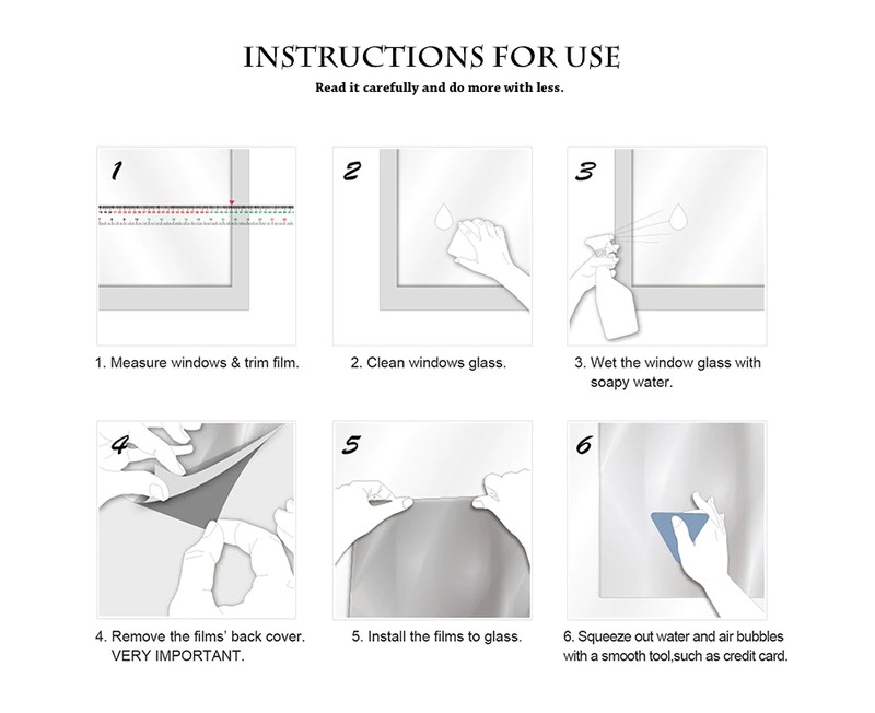⭐静的接着剤および非接着剤-この自己接着性ウィンドウプライバシーフィルムは、接着剤のデザインがなく、化学的放出がなく、取り付けが非常に簡単です。窓の表面が完全にきれいで、傷がないことを確認してください。 粘着面と窓の両方を浸すために、石鹸と水の混合物をたくさん使用することを忘れないでください。-注意: フィルムからはがされた面はガラスに取り付けてください。