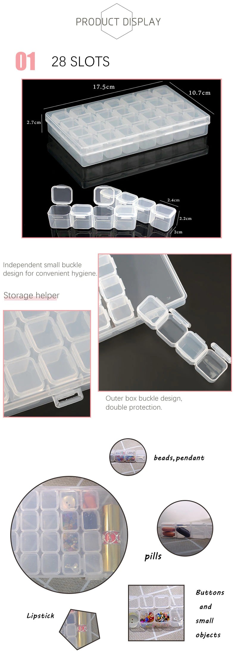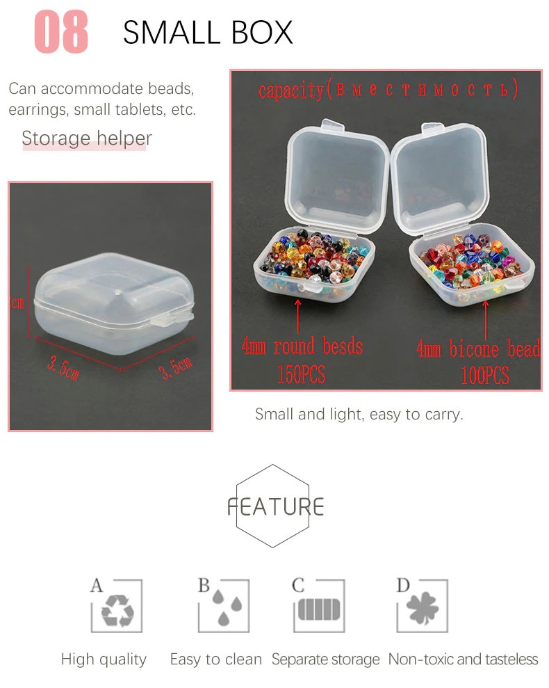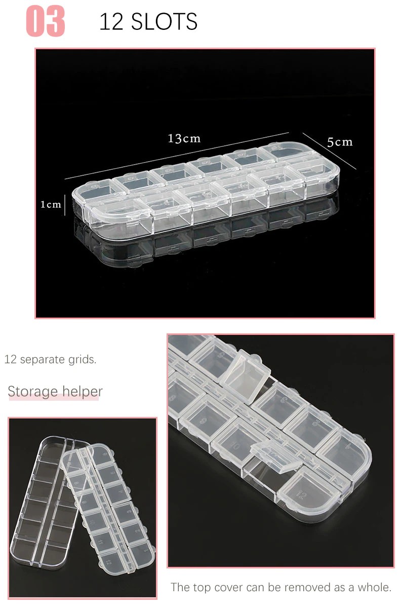 イヤリング、ネックレス、ビーズ、指輪、その他の小さなジュエリー、ネイルアート、メイクアップ、ピル製品の保管に適用でき、通常の収納ボックスの使用、コインの配置、ボールペン、針やその他の小物。コンポーネントボックス、部品、ICチップボックスなども行います。