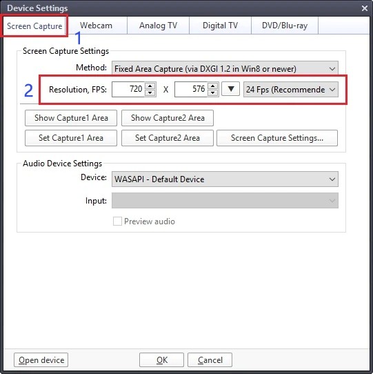 5.ビデオの解像度を変更する場合は、 [potplayerデバイス設定を開く...] をクリックします。 ショートカット「alt + d」を使用してデバイス設定ウィンドウを開きます。 「スクリーンキャプチャ」を選択すると、解像度を変更できます。