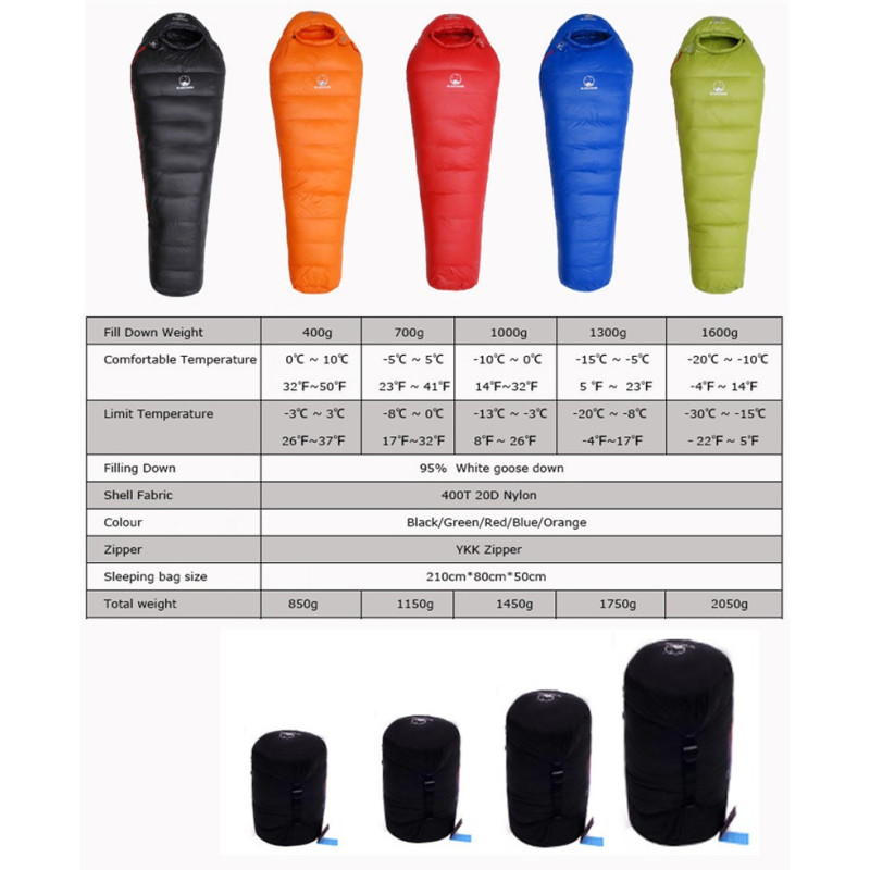 寝袋の重量1150g、詰め物の重量は700g、快適な温度:-5〜5 ℃