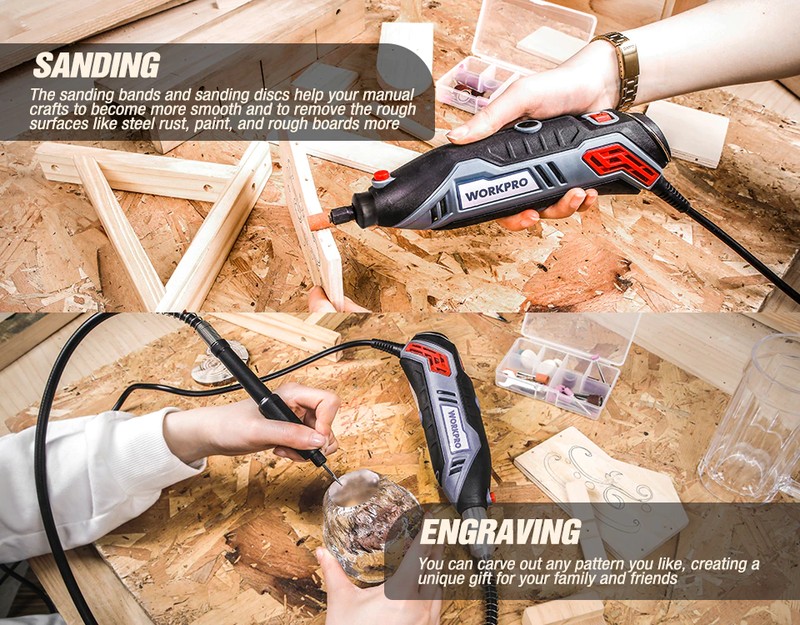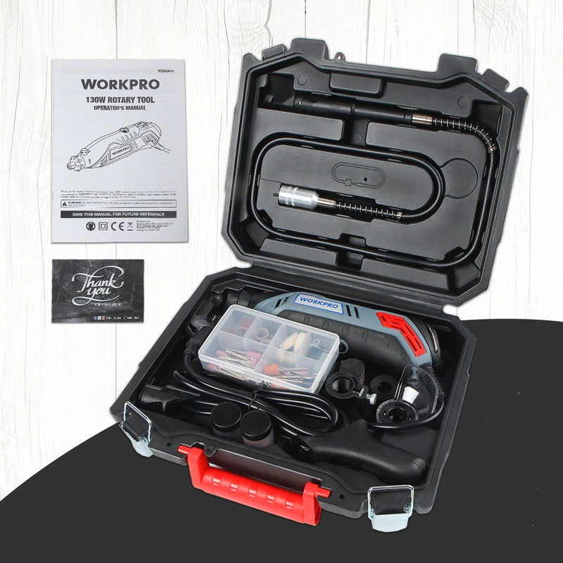 Model WorkPro W123004A、通常の速度よりもはるかに優れています。キット内のすべてのデバイスが、個別に購入するよりも安くなったことは非常にクールです。すべてのデバイスは良質です。ハンドルはユニークで、はっきりと座っていて、パズがあり、以前は購入したハンドルが同じミニドリルの下に収まらなかったので、すべてを掛けていました。柔軟なシャフトは良好で、グラファイト潤滑剤を追加すると、すべてが問題ありません。ロックボタンは、最後までownれた場合にのみ、必ずしもはっきりとクランプされるとは限りません。スーツケースの上部プラスチックは非常に薄く、実際には薄い段ボールのようです。スーツケースは非常にそうです、ループもありません。折りたたむだけです。良いアリシュナヤミニドリル、デコがあります、デザインにほとんど違いはありません。