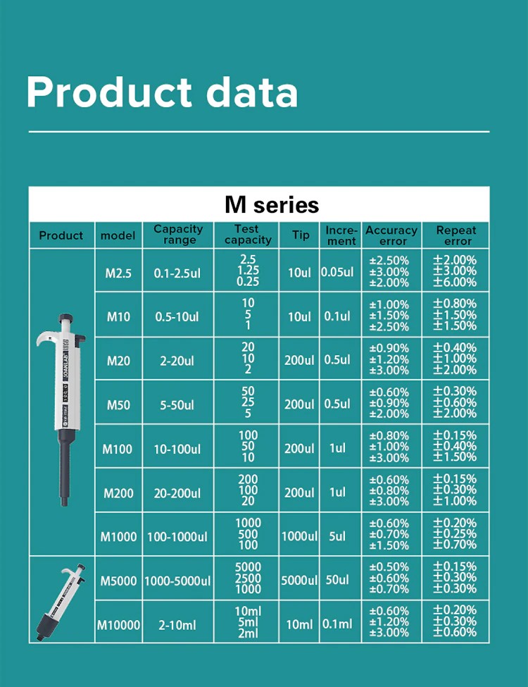M10 | 0.5-10ul | 10 5 1 | ± 1.00% ± 1.50% ± 2.50% | ± 1.00% ± 1.50% ± 2.50% | 0.1ul | 20ul | |