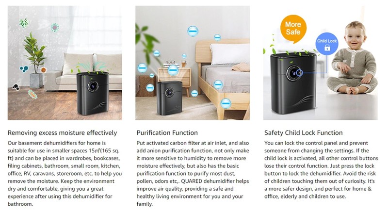 2 in 1 제습기 및 청정기, 동체 내부에 반도체 구성 요소를 설치하고, 활성탄 필터를 공기 흡입구에 넣고, 음이온 정화 기능도 추가하고, 습도에 더 민감하게 만들어 더 많은 수분을 효과적으로 제거 할뿐만 아니라 대부분의 먼지, 꽃가루 정화 기능도 있습니다. 냄새 등. 제습기는 공기 질을 향상시키고 사용자와 가족에게 안전하고 건강한 생활 환경을 제공합니다.