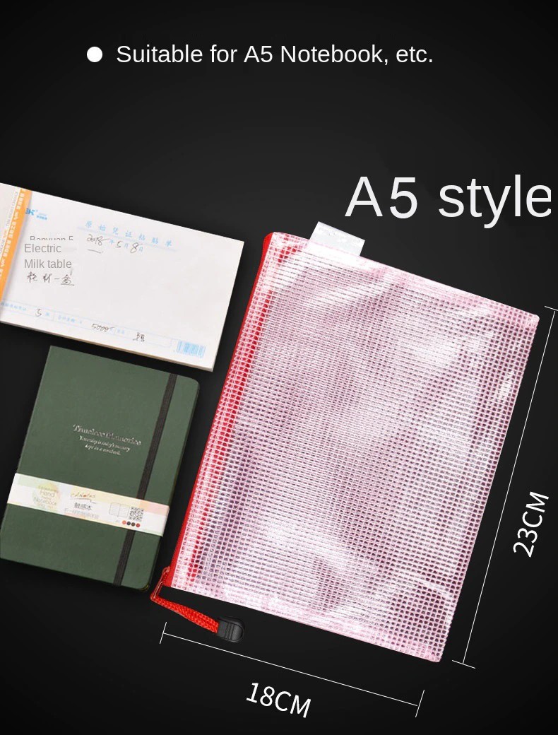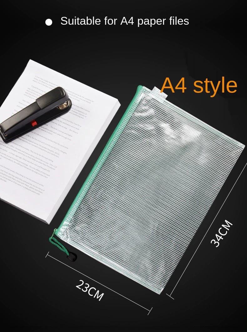 문서, 신문 및 잡지를 절단하고 붙여 넣기에 적합합니다. 그것은 구멍을 뚫지 않고 깔끔하게 유지할 수 있습니다. 지퍼 백에는 반투명 디자인이 있고, 오프닝은 안쪽으로 품목의 손실을 막을 수 있는 플라스틱 지퍼 디자인을 채택합니다. 안쪽으로 공간은 큽니다. 그것은 온갖 문서, 물자 및 다른 학습 및 사무용품을 저장할 수 있고, 학습, 사무실 및 선물 주기를 위해 적당합니다. 지퍼 그물 부대는 고품질 환경 보호 물자로 만들고, A4 명세로 만듭니다. 물자는 학교, 기업, 단위 및 다른 장소를 위해 적당한 공기 침투성, 착용 저항, 고열 저항 및 내식성의 특성이 있습니다.