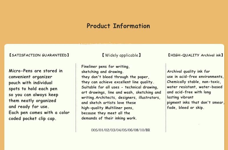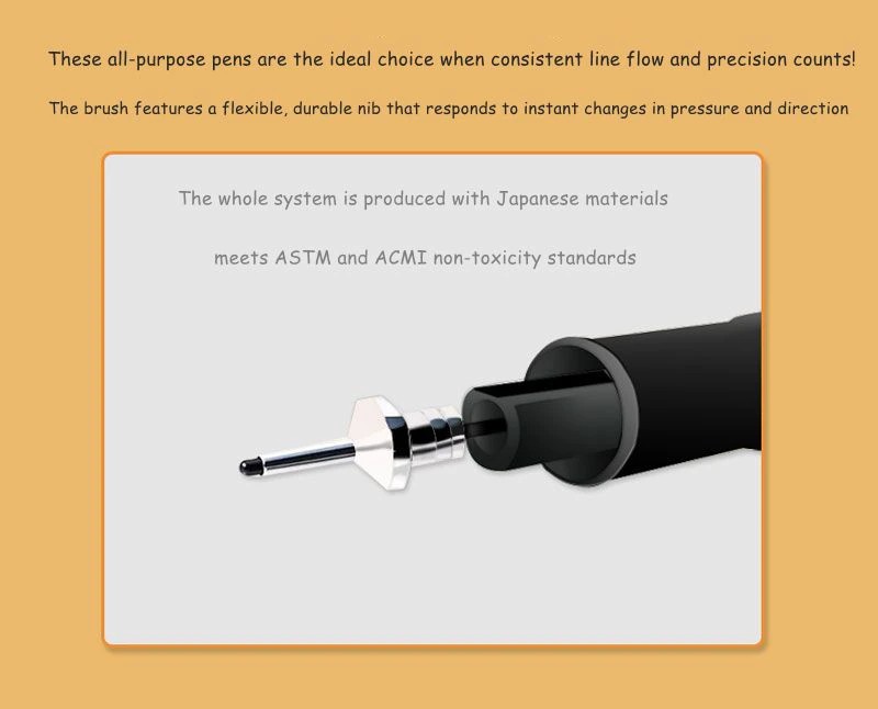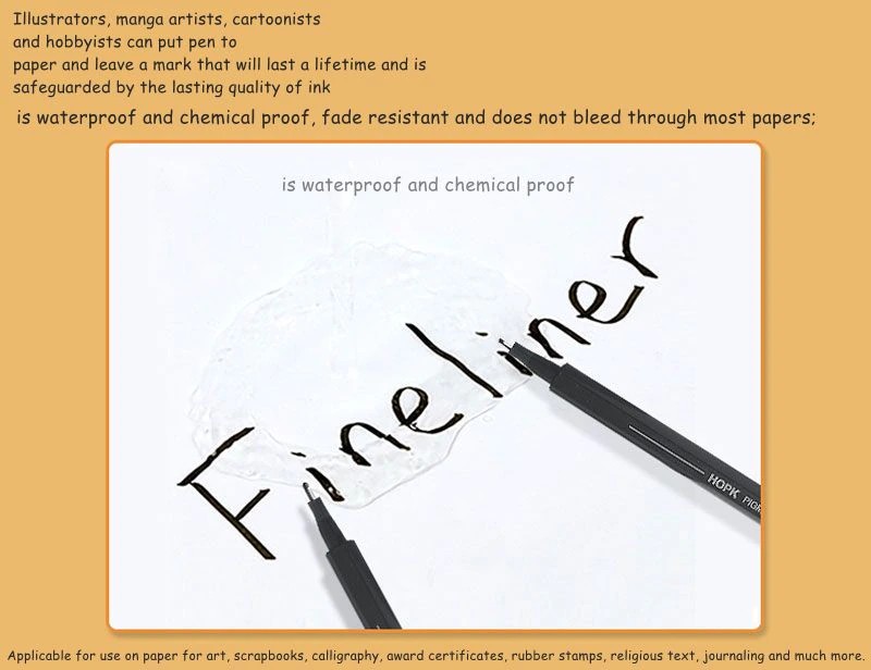 마이크론 펜은 그래픽 아트 작품, 스크랩북, 보관 기록, 일러스트, 프리 핸드 아트, 고무 스탬프, 만화 그림 및 직물 최적의 청소 결과를 위해 100% 면 직물에 적합합니다. HP 잉크는 염료 잉크 정립보다 복잡하고 안정적 일 수 있습니다. 튼튼한 잉크 chemicalproof 반대로 퇴색, 방수. 건조 할 때 얼룩 또는 깃털 없음. 대부분의 종이를 관통하지 않습니다. ASTM 및 ACMI nontoxicity 기준을 만납니다.