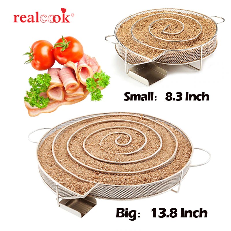 Realcook 13.78 인치 차가운 연기 발생기 숯불 바베큐 라운드 메쉬 애플 우드 칩 스모커 바베큐 그릴 액세서리 연어