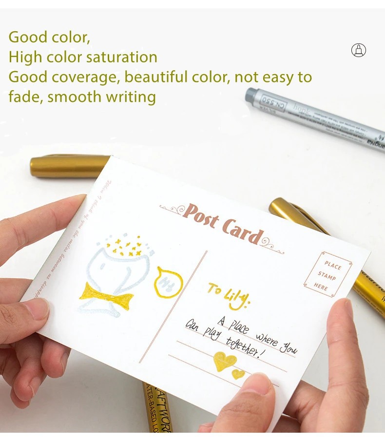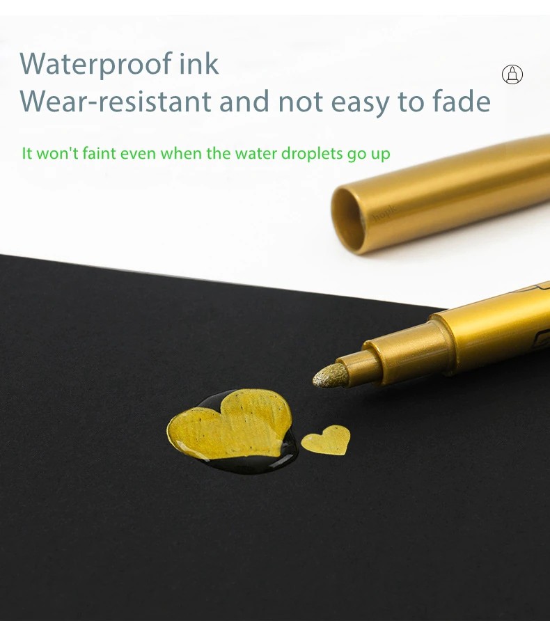 특징: 잉크는 빛나고, 오래 견딘 퇴색하지 않으며, 유리제 세라믹스, 수지 플라스틱, 금속, 종이와 같은 매끄러운 표면에 등 쓰여질 수 있습니다.
