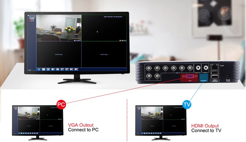 사용 자기 적응 기술 지원합니다 5 종류의 카메라 모드: 아날로그 AHD IP TVI 및 CVI. 완벽한 시스템을 연결하는 것은 매우 쉽습니다. 카메라 모드와 PAL/NTSC 형식을 전환 할 필요가 없습니다.