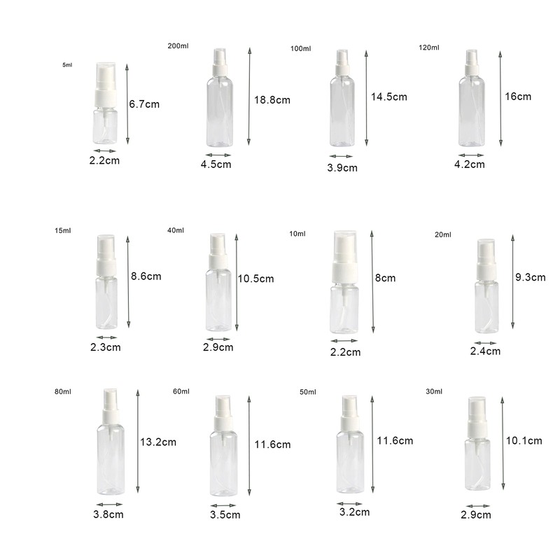 5PCS/10ML/20ML/30ML/50ML/60ML/100ML/200ML 휴대용 여행 미니 투명 플라스틱 빈 화장품 샘플 스프레이 병 메이크업 습기 원자화 향수 병