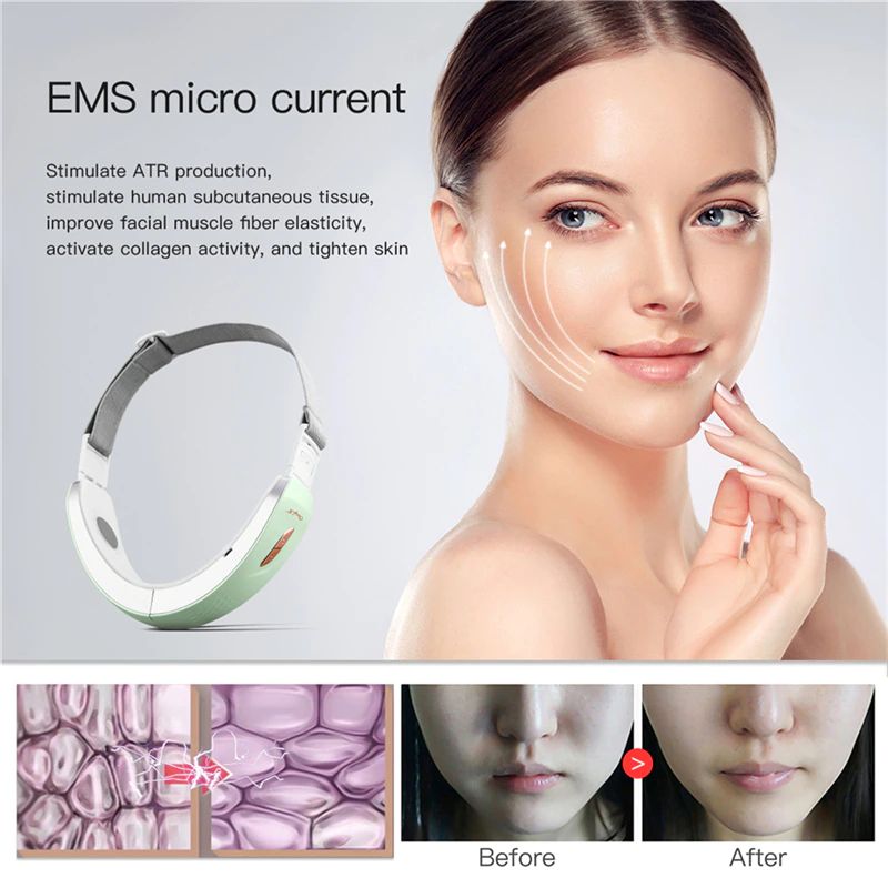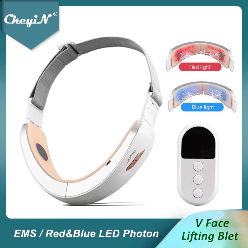 CkeyiN 진 V 자형 리프트 벨트 기계 진동 가열 레드 블루 LED 광자 치료 얼굴 리프팅 장치 얼굴 슬리밍 갈바니 마사지 V-얼굴 관리