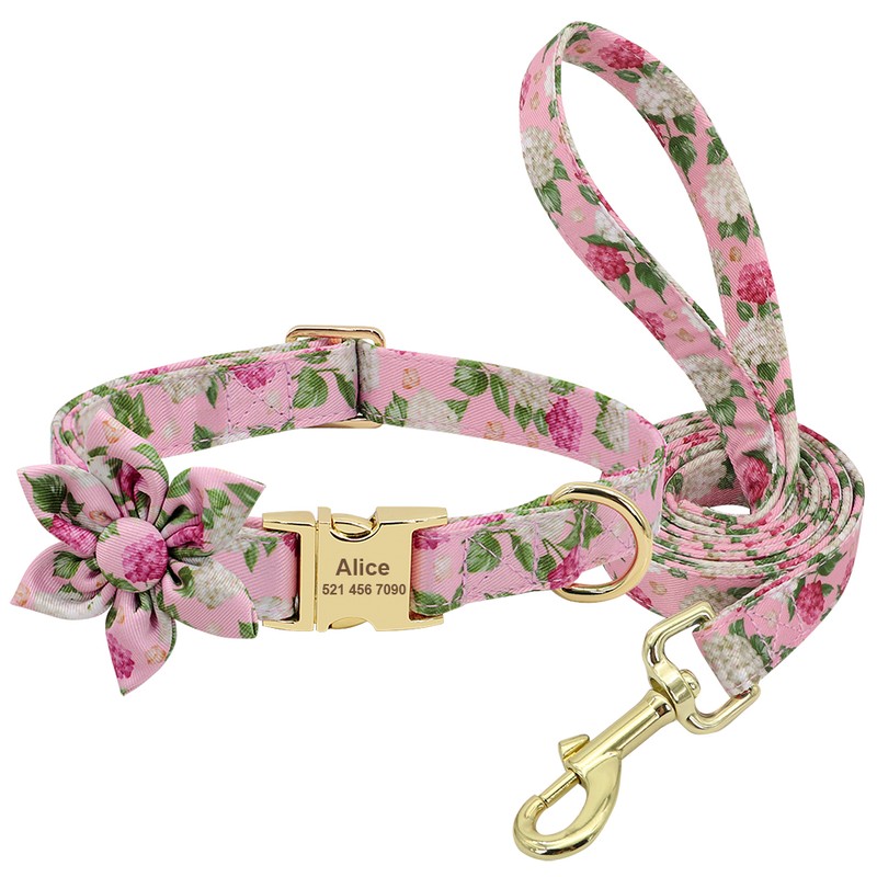 가죽 끈으로 사용자 정의 새겨진 개 목걸이 나일론 인쇄 개 ID 고리 작은 중형 대형 개를위한 애완 동물 산책 벨트 꽃 액세서리