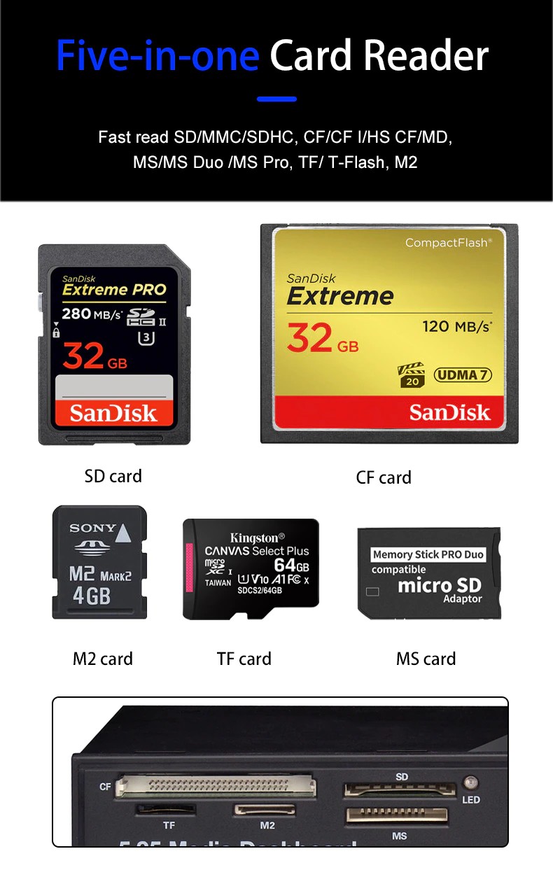 통합 카드 리더기: SD 카드, TF (마이크로 SD), MS (메모리 스틱 듀오/프로), CF (컴팩트 플래시), M2 (메모리 스틱 마이크로), MMC (멀티 미디어 카드); 삽입하기 전에 SD 카드를 잠금을 해제하십시오. 삽입 할 때 CF 카드 핀을 구부리지 마십시오.