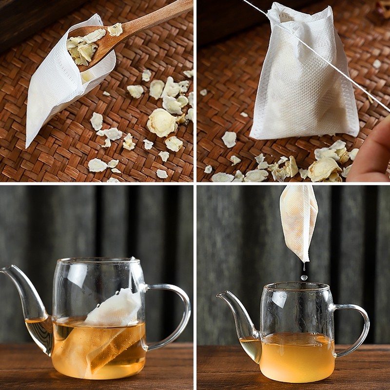 이 티백은 최고 품질로 제조됩니다. 밀봉을 위해 가열 할 필요가 없으며 끈을 당기고 작은 매듭을 묶으십시오.
