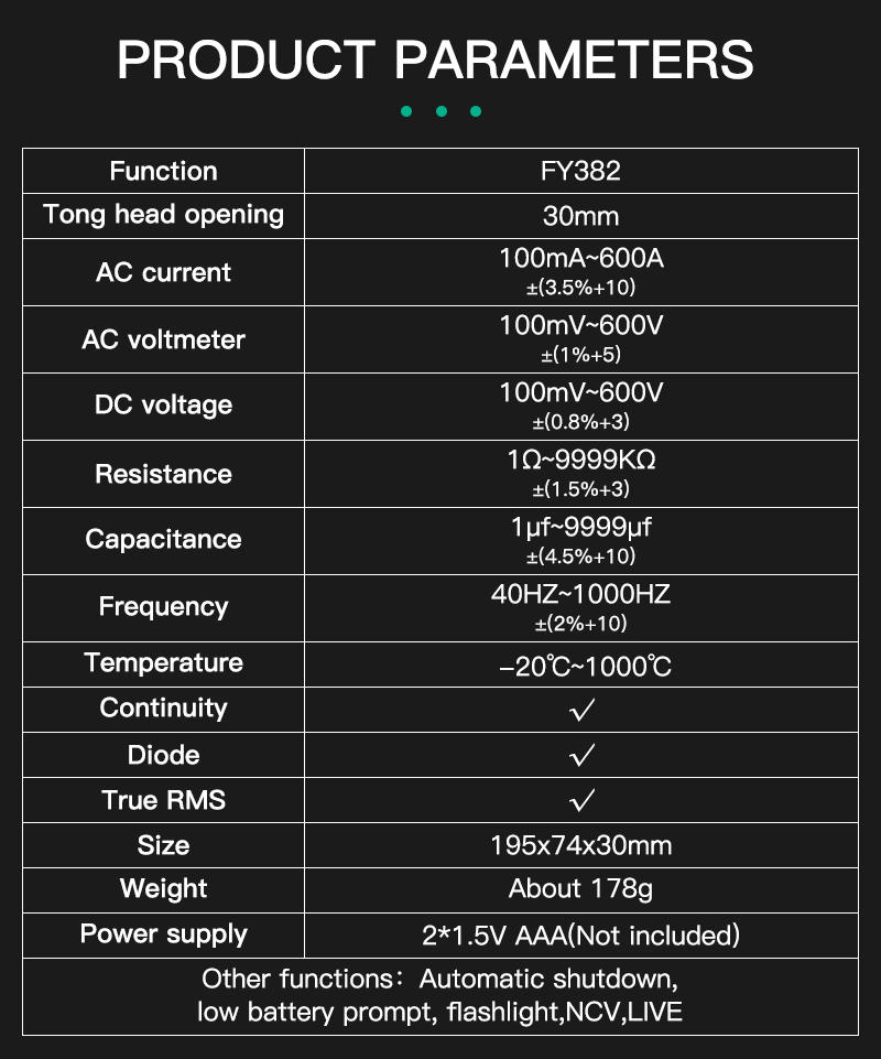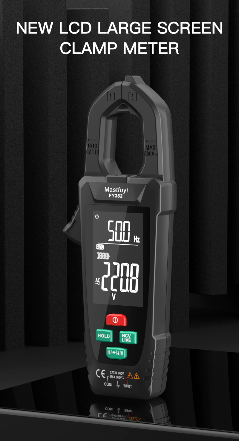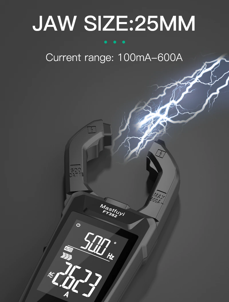 FY382 빅 스크린 디지털 클램프 미터 스마트 플라이어 전류계 AC 전류 전압 멀티 미터 True RMS 온도 커패시턴스 NCV 라이브 테스트
