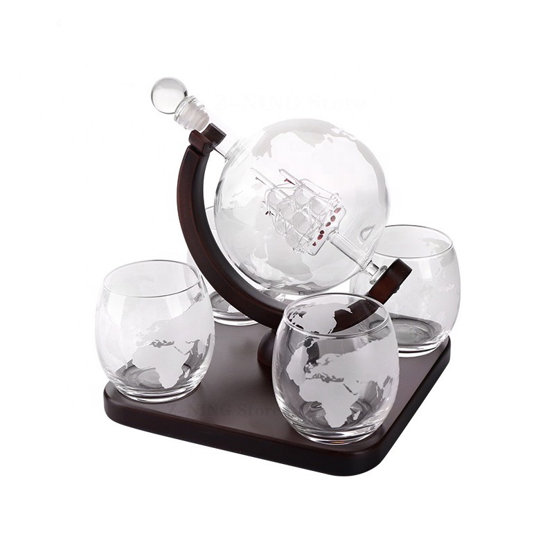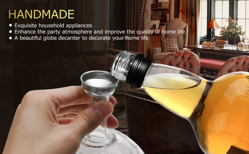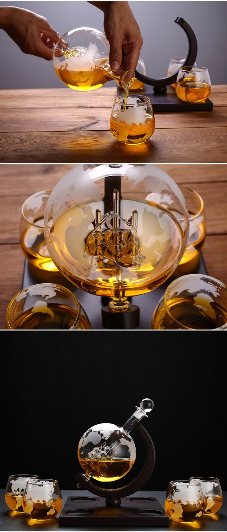 1, 위스키 디켄터 세트: 프리미엄 위스키 디켄터 세트는 안쪽으로 독특하고 복잡한 배로 손으로 날리는 우아하게 만들어진 1000ml 글로브 디켄터로 완성됩니다. 알코올을 더 재미있게 보이고 초대하십시오. 우리의 세계는 잘 생긴 마호가니 스테인드 우드 트레이에 설정되어 우리의 세계지도와 에칭 된 4 개의 안경을 동반합니다.