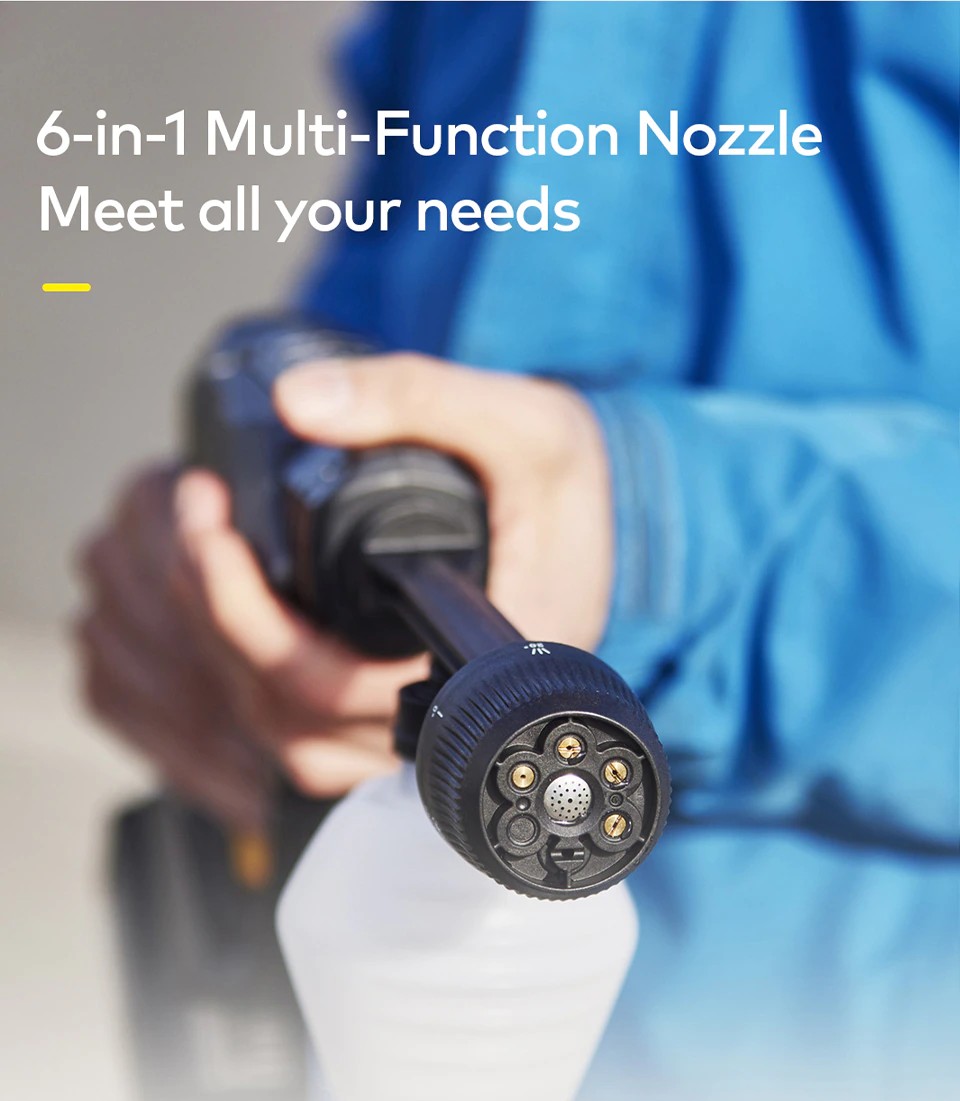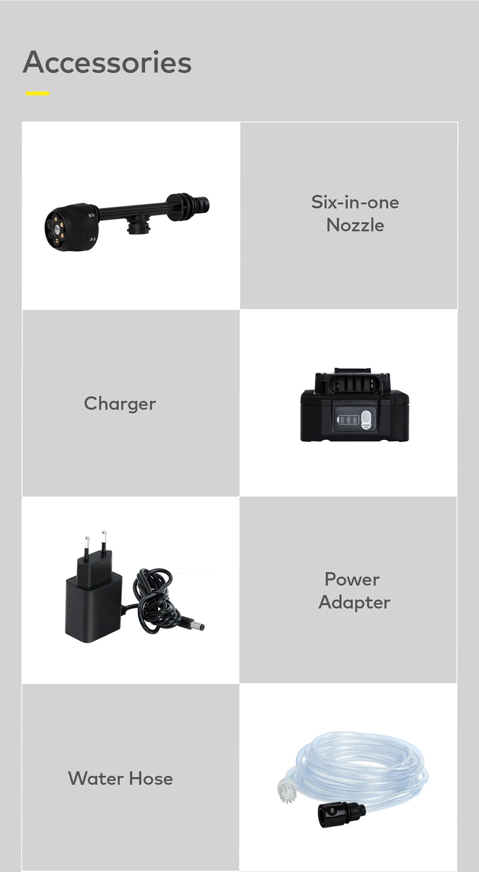6-in-1 노즐, 충전기, 전원 어댑터, 물 호스, 샴푸 캐니스터