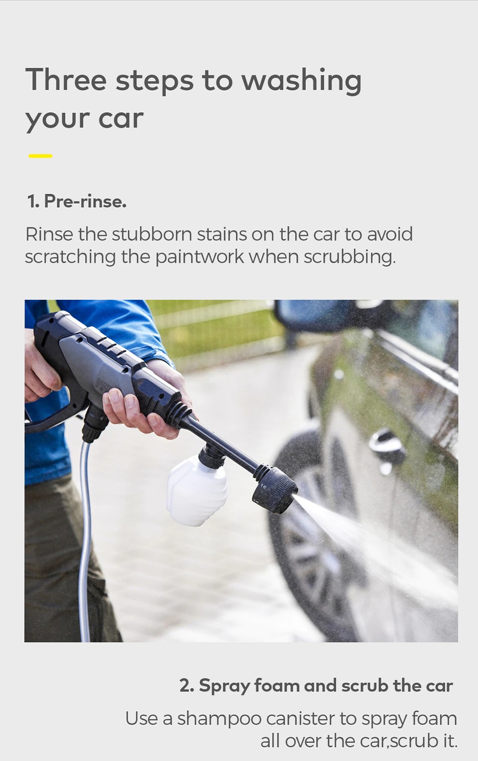 샴푸 용기를 사용하여 차 전체에 거품을 뿌리고 문지릅니다.