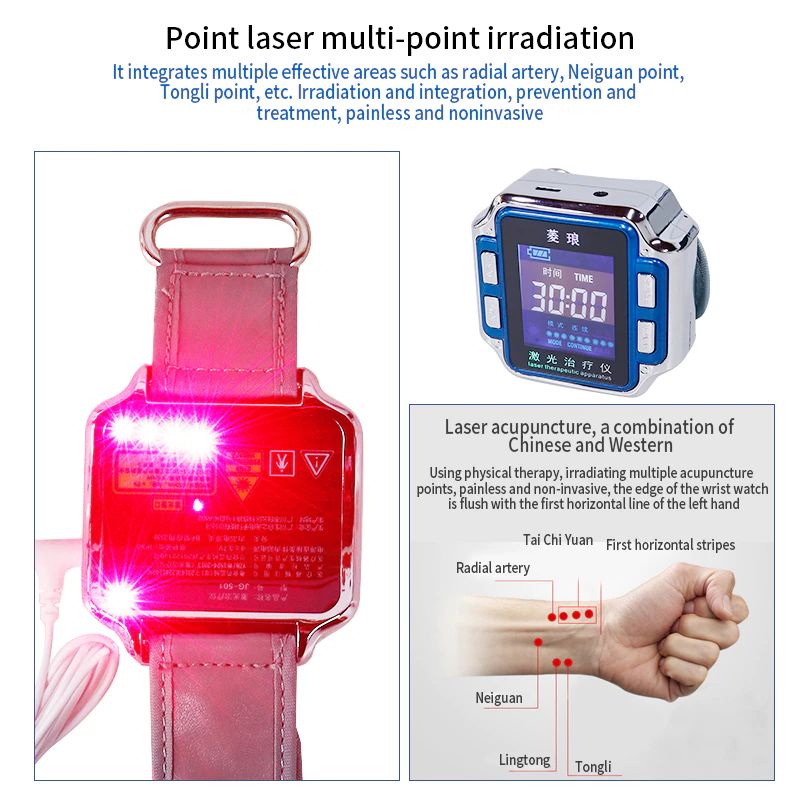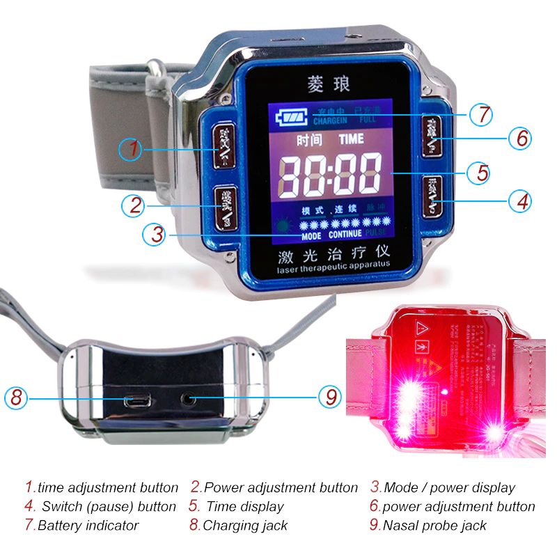 다음 조건은 엄격히 금지됩니다. 임신, 암, 출혈 질병. 급성 심근 경색을 겪는 사람은, 출혈 경향이있는 질병이나 질병이 당뇨병 손목 시계를 사용하는 것이 금지되어 있습니다. 레이저가 발광될 때 동공 지역에서 레이저를 멀리 유지하십시오.