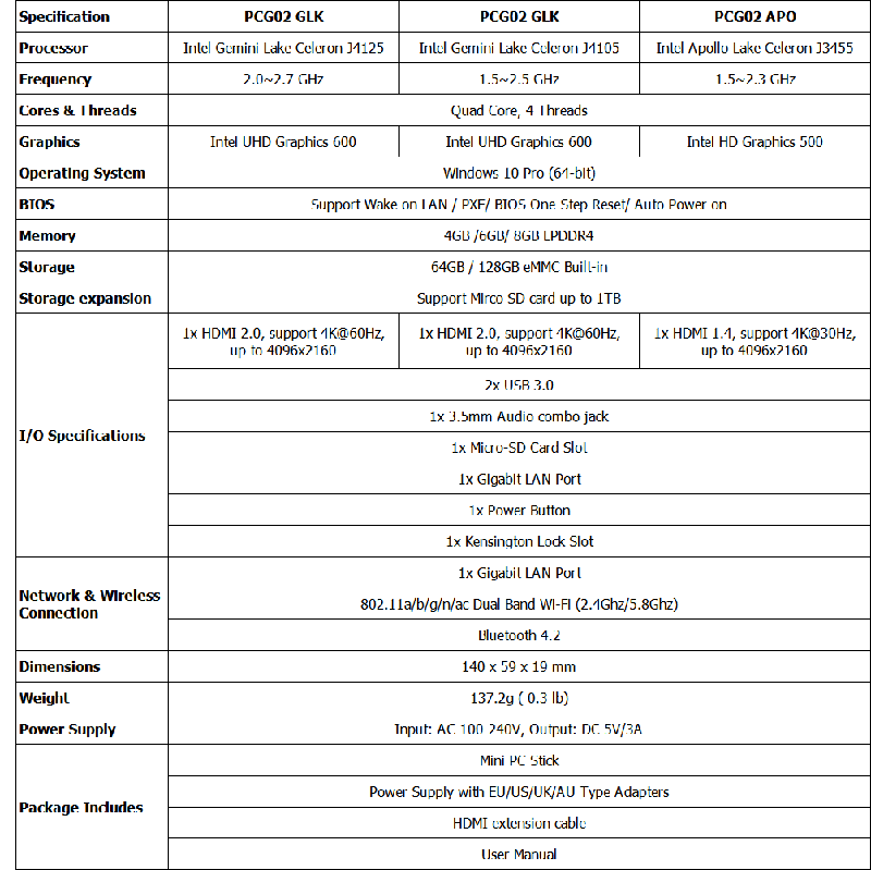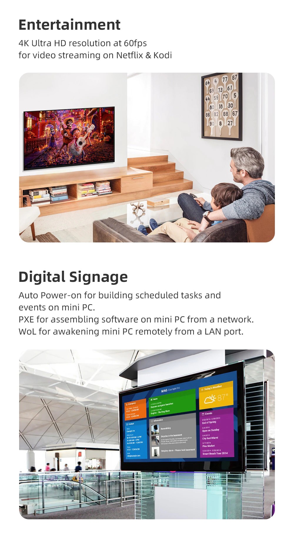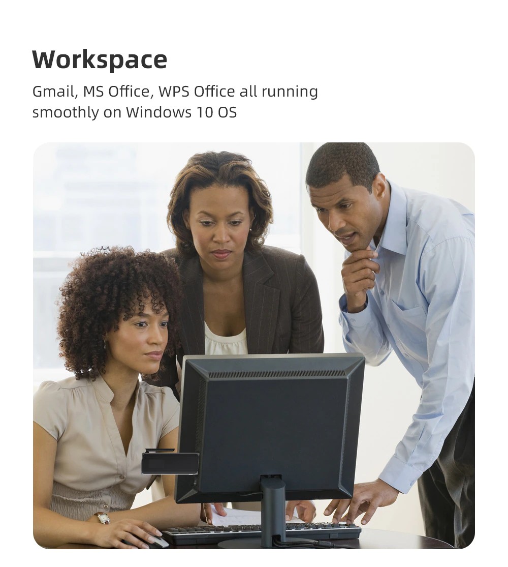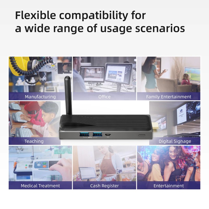 인텔 셀러론 쿼드코어 프로세서, 최대 8GB 메모리, 최대 128GB, Windows 10 Pro OS 사전 설치, 비디오 출력 지원, 최대 4K @ 60Hz, 최대 해상도 4096x2160, 홈 엔터테인먼트, 사무실, 교육, 교육 센터, 디지털 사이 니지, IOT 프로젝트 등에 널리 사용됩니다.