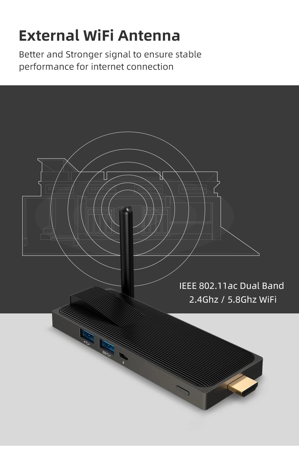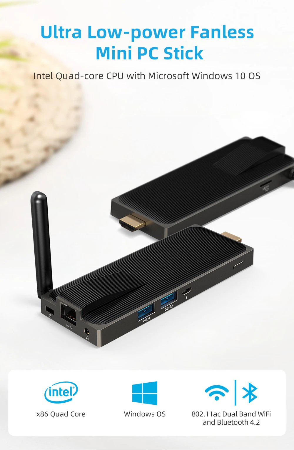 MeLE-팬리스 미니 PC 스틱은 포켓 크기의 완전 기능을 갖춘 윈도우 pc로, 윈도우 10 프로의 전체 버전을 사전로드 모든 tv를 눈길을 끄는 디지털 사이 니지 화면으로 변환하고 집, 사무실 또는 필요한 다른 곳으로 컴퓨터 가능한 세계를 열 수 있습니다.